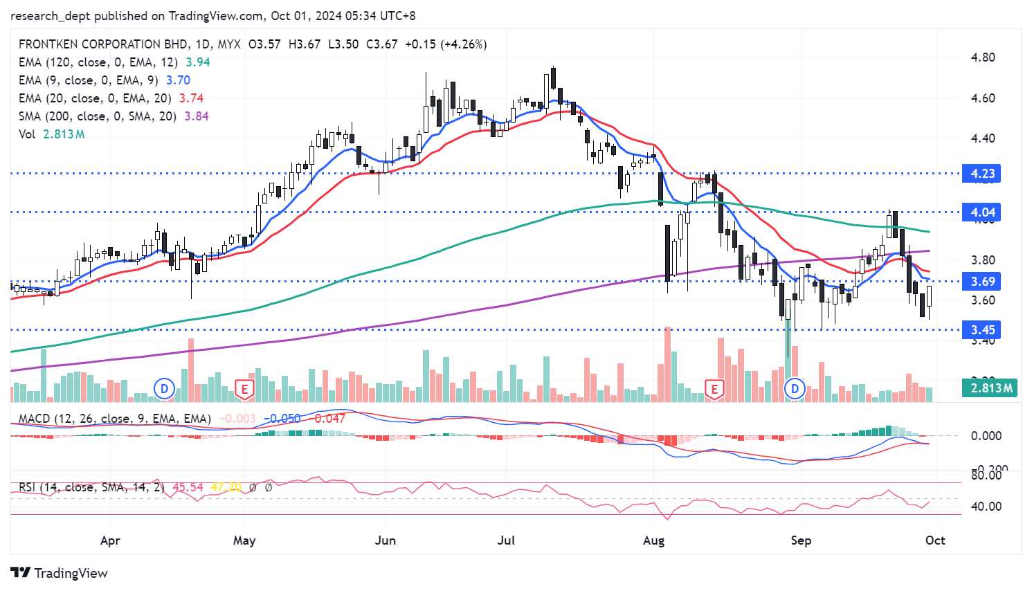 After multi-month of correction, price formed a hammer candle before staging a rebound. The recovery, however, was shrt-lived as volatility brought price back below SMA200. With price forming a bullish candle yesterday, traders may anticipate for an extension of recovery above RM3.69 to target the next resistances located at RM4.04-4.23. Downside wise, support is pegged at RM3.45.