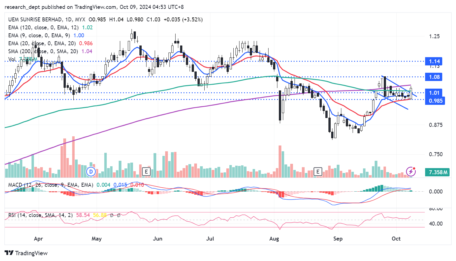 Technical Commentary: After forming a re-tracement in recent weeks, price appears to have bottomed out and staged a rebound last month. The recovery took a breather as price staged a mild pullback towards EMA20. Price has formed a bullish candle yesterday and experienced a f lag-format ion breakout above RM1.01. Price may advance to target the next resistances located at RM1.08- 1.14. Downside wise, support is pegged at RM0.985.