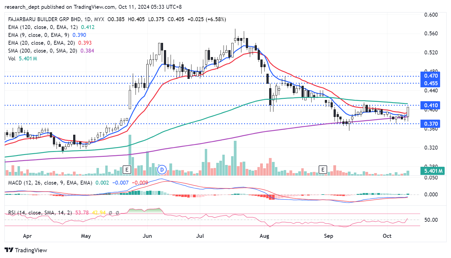 Technical Commentary: Price has formed a correction after peaking in July. After bouncing off SMA200, price has turned into a consolidation pattern in recent months. Coming closer, price has formed a bullish candle to climb above EMA20 accompanied by rising volumes. Traders may monitor for a potential breakout above RM0.41 to target the next resistances located at RM0.455- 0.47. Downside wise, support is envisaged at RM0.37.