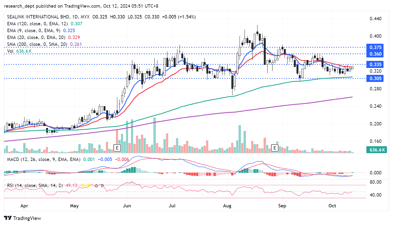 Price has formed a pullback pattern since peaking in August. After bouncing off EMA120, the recovery was short-lived as price staged a mild pullback. With a consolidation shaping up, traders may monitor for a potential breakout above RM0.335 to target the next resistances located at RM0.36- 0.375. Downside wise, support is pegged at RM0.305.