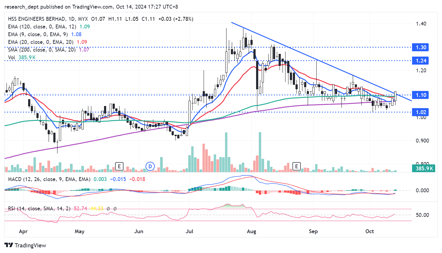 Price formed a correction mode over the past couple of months before hovering around SMA200 lately. After establishing a mild consolidation, price advanced above EMA20 and consequently formed a trendline breakout above RM1.10. Price may advance to target the next resistances located at RM1.24-1.30. Downside wise, support is envisaged at RM1.02.