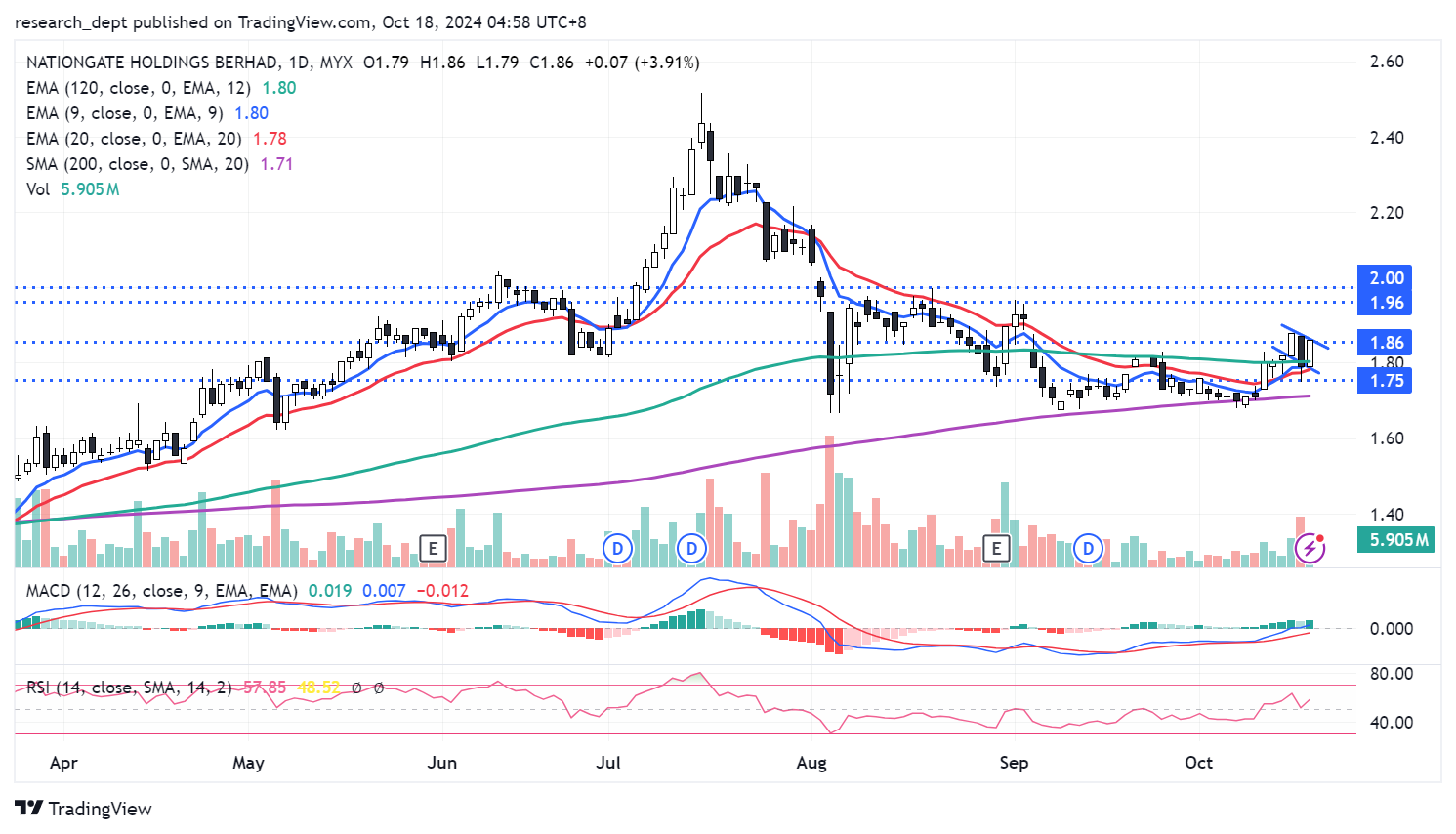 After peaking in July, price has turned into a correction phase. Price managed to bounced off SMA200 twice and staged a mild recovery lately. With the recovery above EMA120, traders may monitor for a potential flag-formation breakout above RM1.86 to target the next resistances located at RM1.96-2.00. Downside wise, support is envisaged at RM1.75.