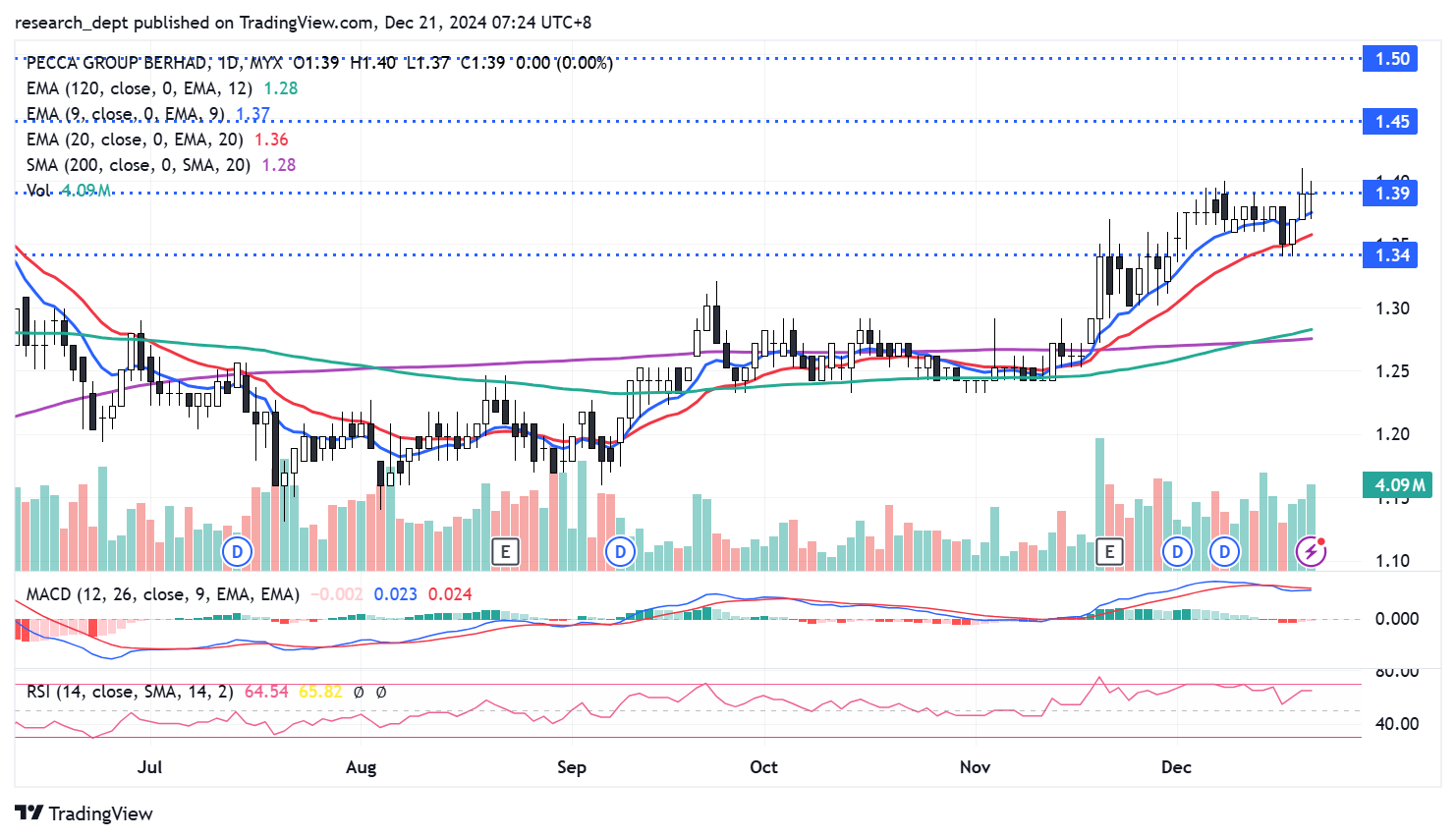 Price has formed a rounding bottom in August-September period and subsequently marched higher. After finding stability above EMA120, price advanced and the uptrend formation was established. Traders may monitor for a potential breakout above RM1.39 to target the next resistances located at RM1.45.-RM1.50. Downside wise, support is envisaged at RM1.34.