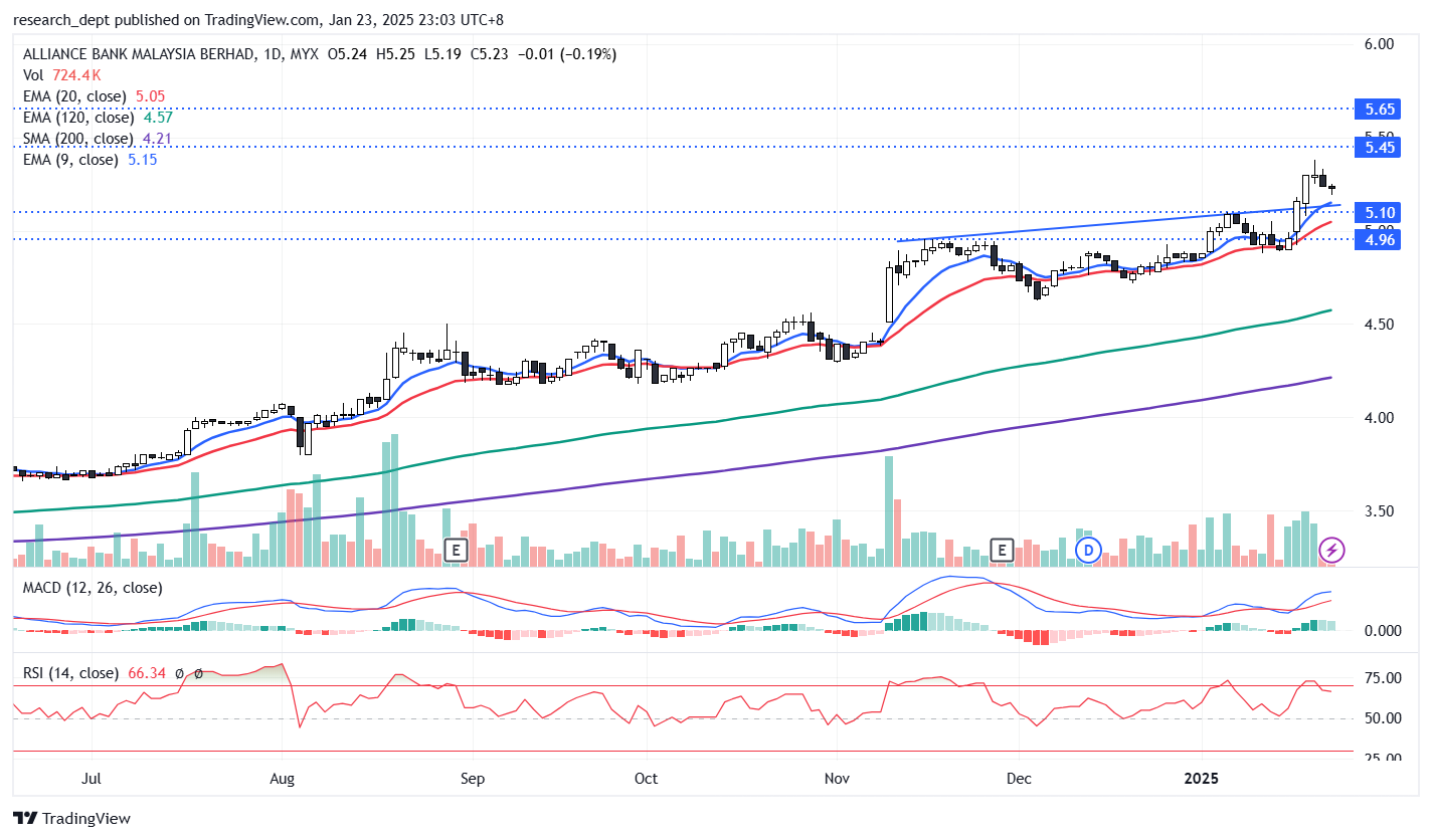 Price is on the uptrend formation and was largely supported above EMA9. Coming closer, price has formed a trendline breakout above RM5.10 and close above all moving averages. For now, traders may monitor for pullback towards RM5.10 for a potential rebound to extend its recovery phase to target the next resistances located at RM5.45-RM5.65. Downside wise, support is pegged at RM4.96.