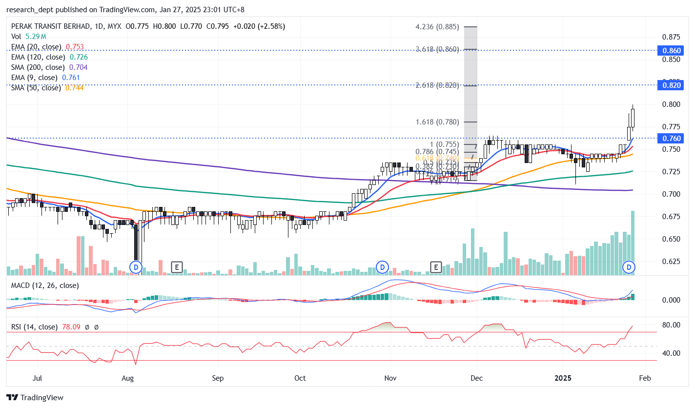 Following a multi-month long of consolidation, price appears to have found stability and bounced off since late November 2024. Coming closer, golden crossover has occurred last month. Following the breakout above RM0.76, price may advance to target the next resistances located at RM0.82-RM0.86. Downside wise, support is pegged at RM0.76.