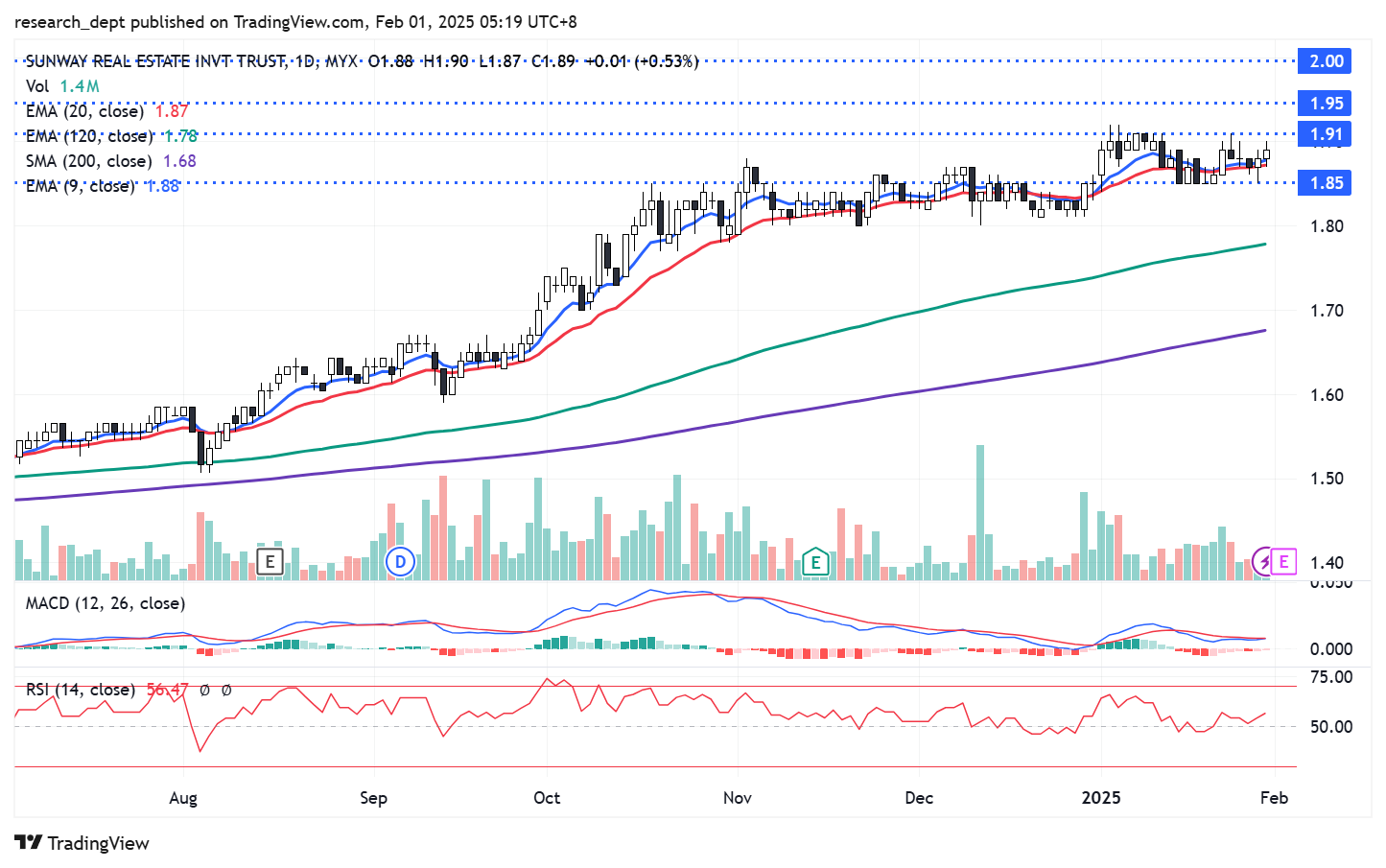 After bouncing off EMA120, price is still on the uptrend formation in recent months. Price has turned into a short-term consolidation pattern since the start of the year. With price oscillating around EMA20, traders may anticipate for a potential short-term breakout above RM1.91 to target the next resistances located at RM1.95- RM2.00. Downside wise, support is envisaged at RM1.85.