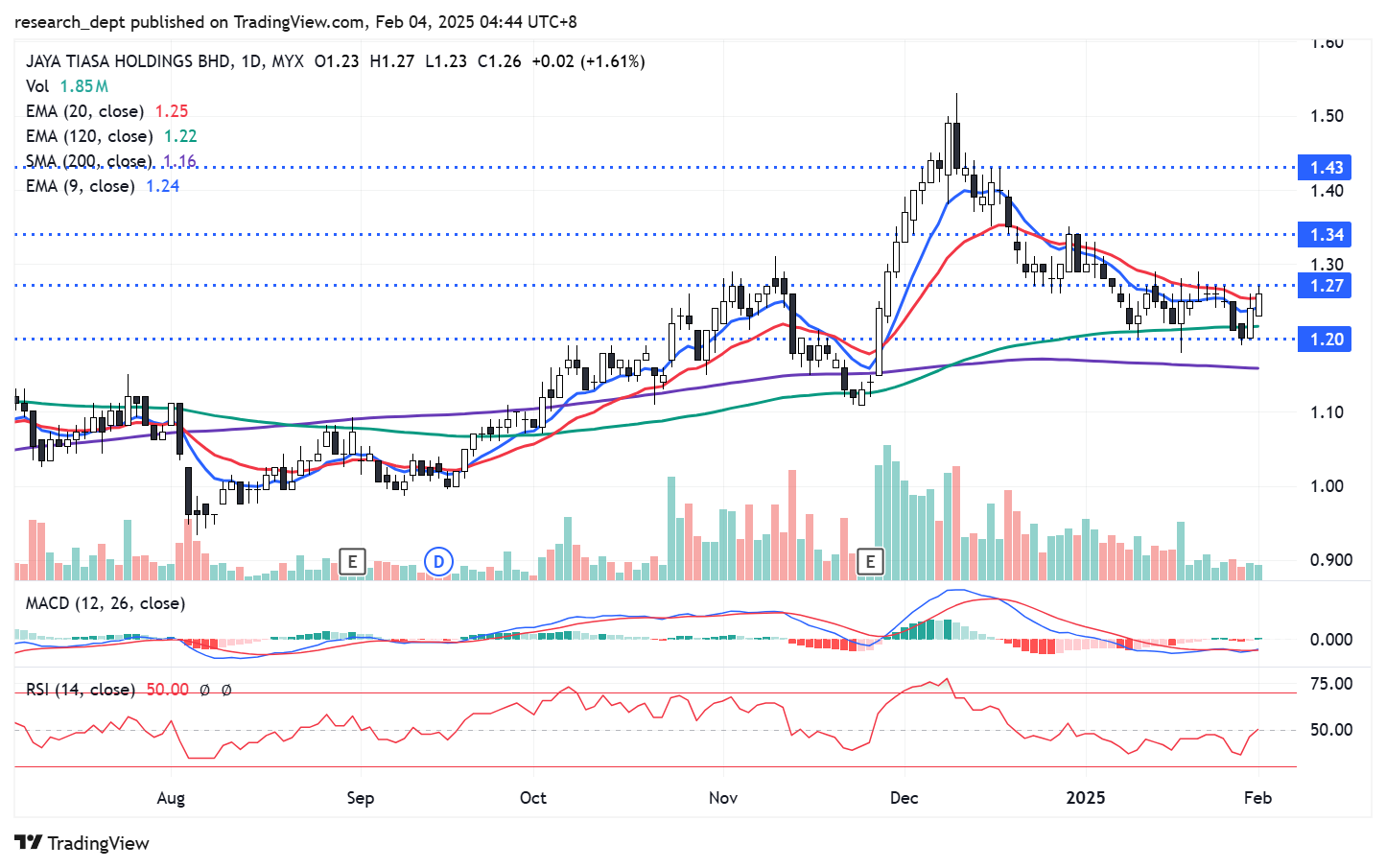 After peaking in early December 2024, price staged a correction before stabilising above EMA120. Price underwent a shot-term consolidation and has recently climbed above EMA20. For now, traders may anticipate for a potential breakout above RM1.27 to target the next resistances located at RM1.34-RM1.43. Downside wise, support is envisaged at RM1.20.