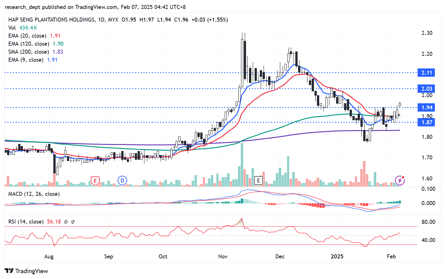 Price staged a sharp correction and has briefly dipped below SMA200. A swift recovery took place as price recovers above all the moving averages lately. Price also formed a resistance breakout above RM1.94 and may advance to target the next resistances located at RM2.03- RM2.11. Downside wise, support is pegged at RM1.87.