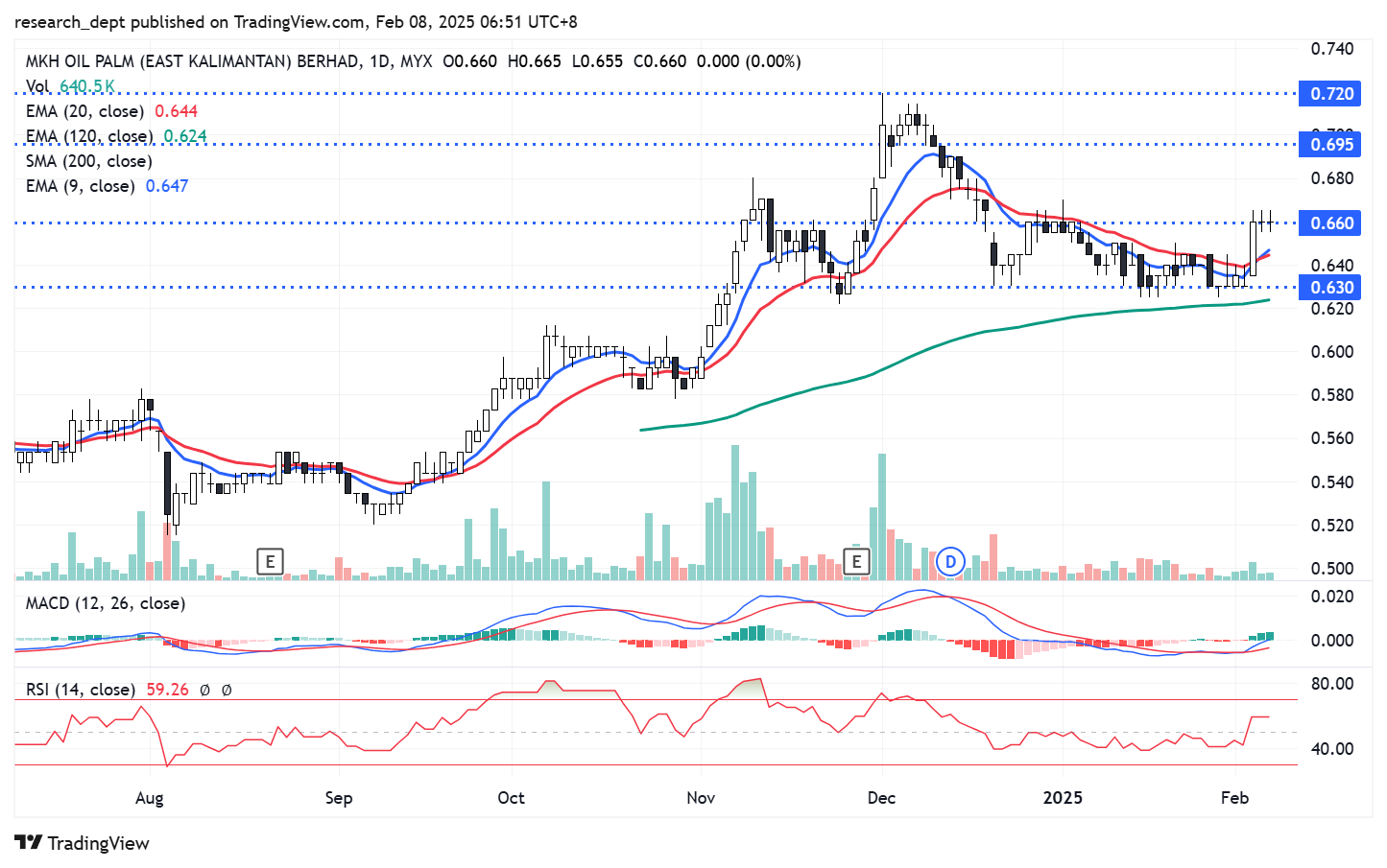 After surging sharply higher and peaked in December 2024, price took a breather. A mild pullback took place and price turned into a consolidation pattern. Following the recent recovery, the uptrend formation was re-established. Traders may anticipate for a potential breakout above RM0.66 to target the next resistances located at RM0.695-RM0.72. Downside wise, support is pegged at RM0.63.