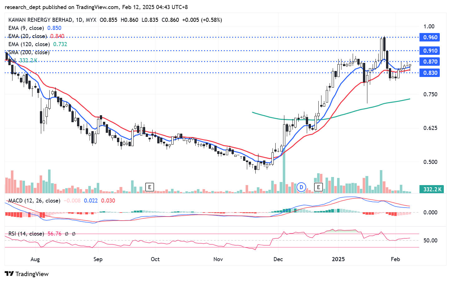 Following the correction towards the recent low in November 2024, price delivered a V-shaped rebound and the uptrend formation was established. After briefly dipped below EMA20, price rebounded and turned into a short-term consolidation. For now, traders may monitor for a potential consolidation breakout above RM0.87 to target the next resistances located at RM0.91- RM0.96. Downside wise, support is envisaged at RM0.83.