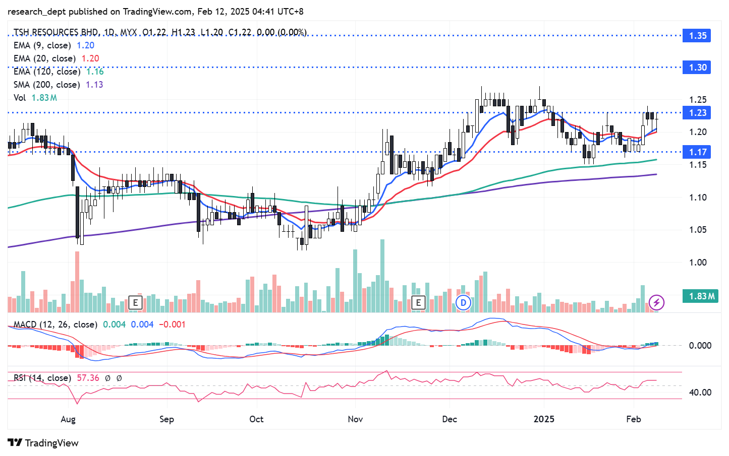 Price is on the rebound mode after finding stability in October 2024. After gradually marching higher, price took a mild breather and pullback towards EMA120. Price staged a recovery and the uptrend formation was re-established lately. For now, traders may anticipate for a potential breakout above RM1.23 to target the next resistances located at RM1.30- RM1.35. Downside wise, support is pegged at RM1.17.