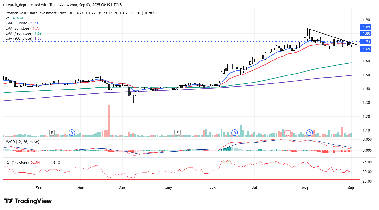 The stock remains in an uptrend since June, advancing while staying above the SMA200. Since mid-August, the stock has entered a consolidation phase under a descending trendline, though it continues to hold above the EMA9 and EMA20. A breakout above RM1.74 would signal the end of consolidation and revive upside momentum toward RM1.80–RM1.85. On the downside, immediate support is located at RM1.69.