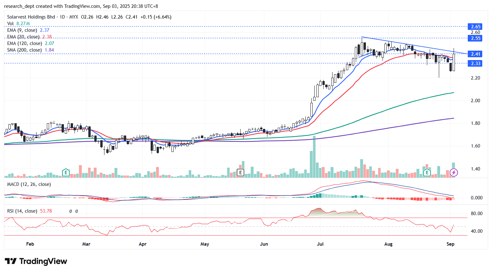 The share price remains in consolidation, having only briefly slipped below the SMA200 in mid-March and early April before regaining upward momentum. Following its July peak, the stock has continued to consolidate. A breakout above RM2.41 would signal renewed upside toward the next resistance zone at RM2.55–RM2.65, while key downside support is anchored at RM2.33.