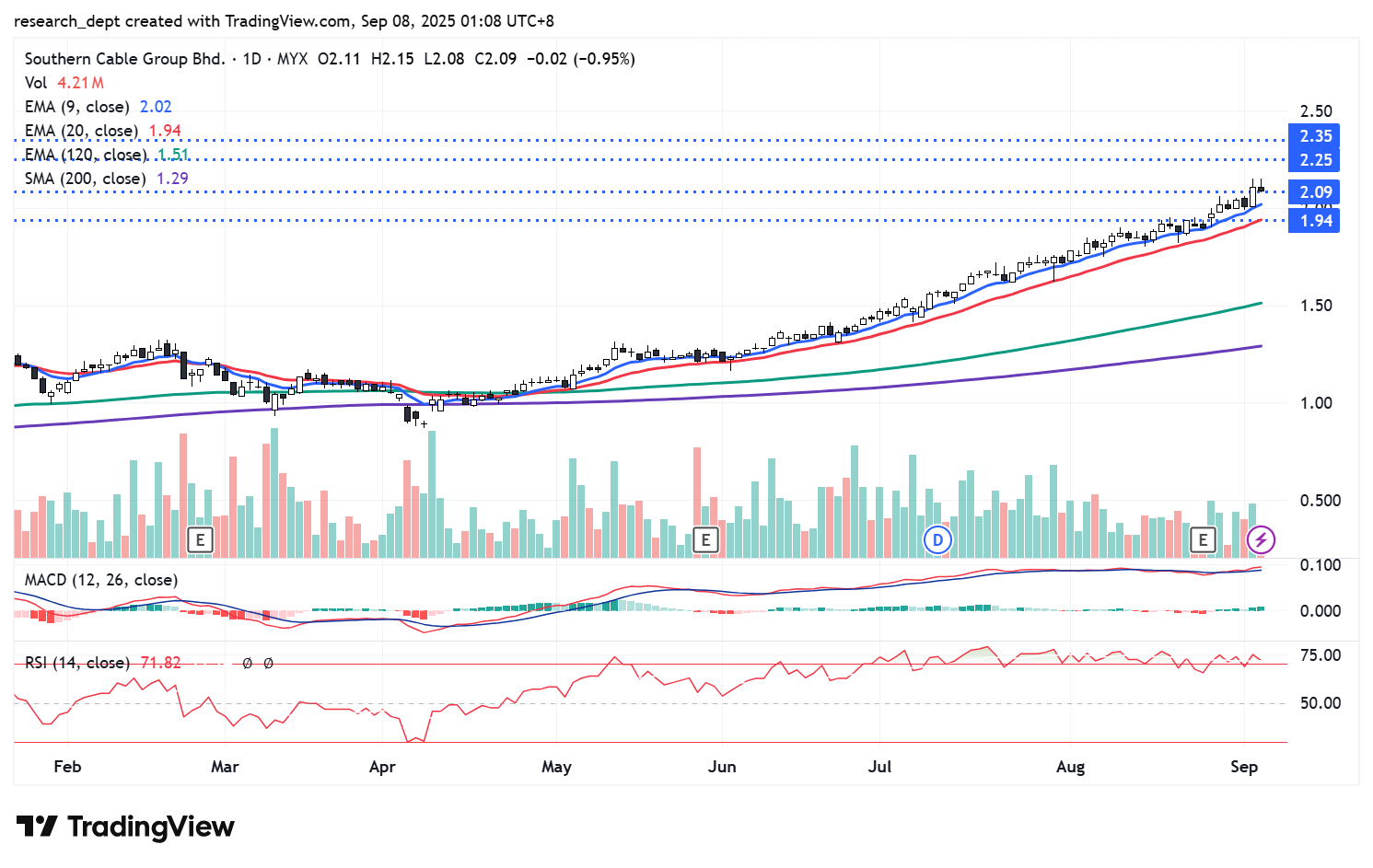 After a period of consolidation, the stock turned higher in June and has since established a steady uptrend. It is now testing resistance at RM2.09, where a decisive breakout could extend gains toward the next resistance zone at RM2.25–RM2.35. On the downside, immediate support is pegged at RM1.94.