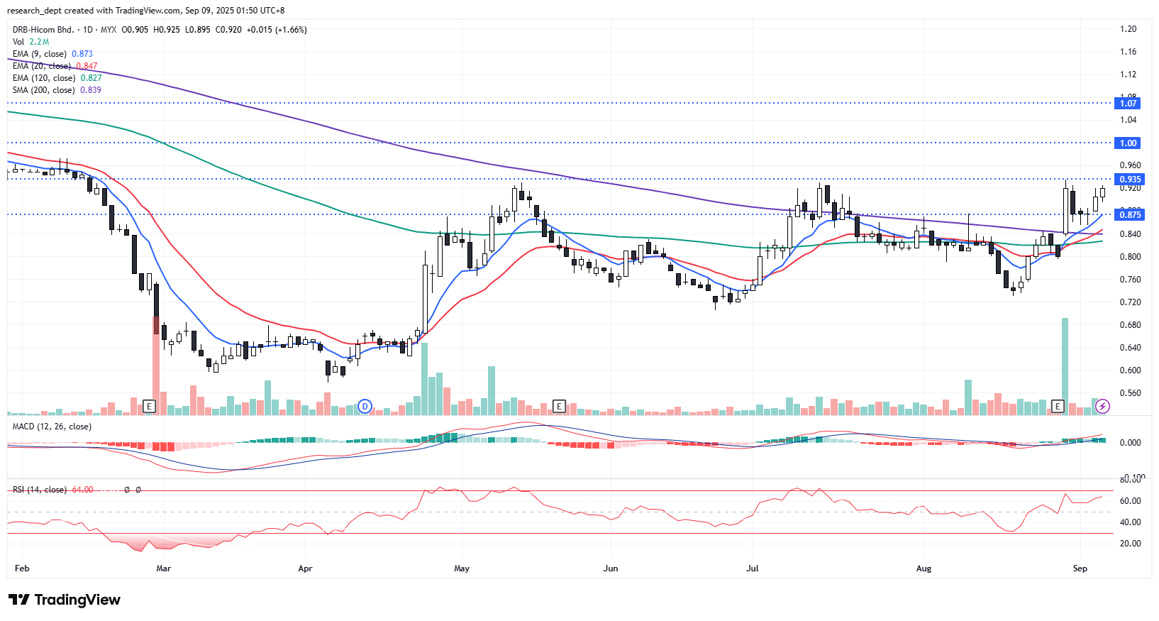 The counter retraced from its early-year peak before bottoming in April. It subsequently recovered the bulk of its losses and completing a double-bottom formation. Fresh momentum has brought the stock back to re-test the RM0.935 resistance level. A decisive breakout above this threshold would validate further bullish momentum, opening scope for an advance toward RM1.00-RM1.07. Immediate support is situated at RM0.875.