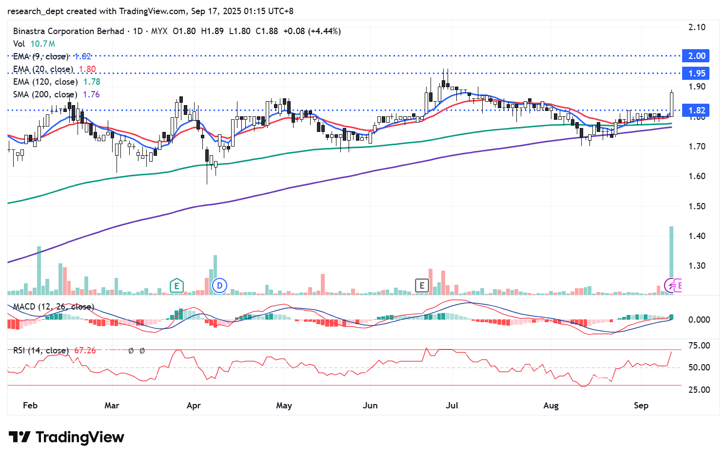 The stock traded sideways for an extended period before attempting a breakout above RM1.80 in mid-June, which formed a short-term peak before retracing into consolidation. It is now retesting the resistance zone between RM1.95-RM2.00 on strong volume. On the downside, support is established at RM1.82.