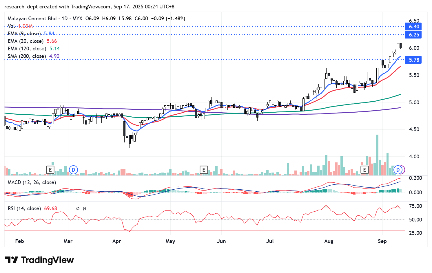 The stock traded sideways in the early part of the year before bottoming out at RM4.24 in April. It then entered a prolonged consolidation phase, followed by an uptrend in late July. It recently broke above RM5.78, though a bearish candle near RM6.00 suggests profit-taking. Despite this, the broader trend remains positive, underpinned by rising moving averages and firm volume. Next resistance levels are seen at RM6.25–RM6.40, while immediate support lies at RM5.78.