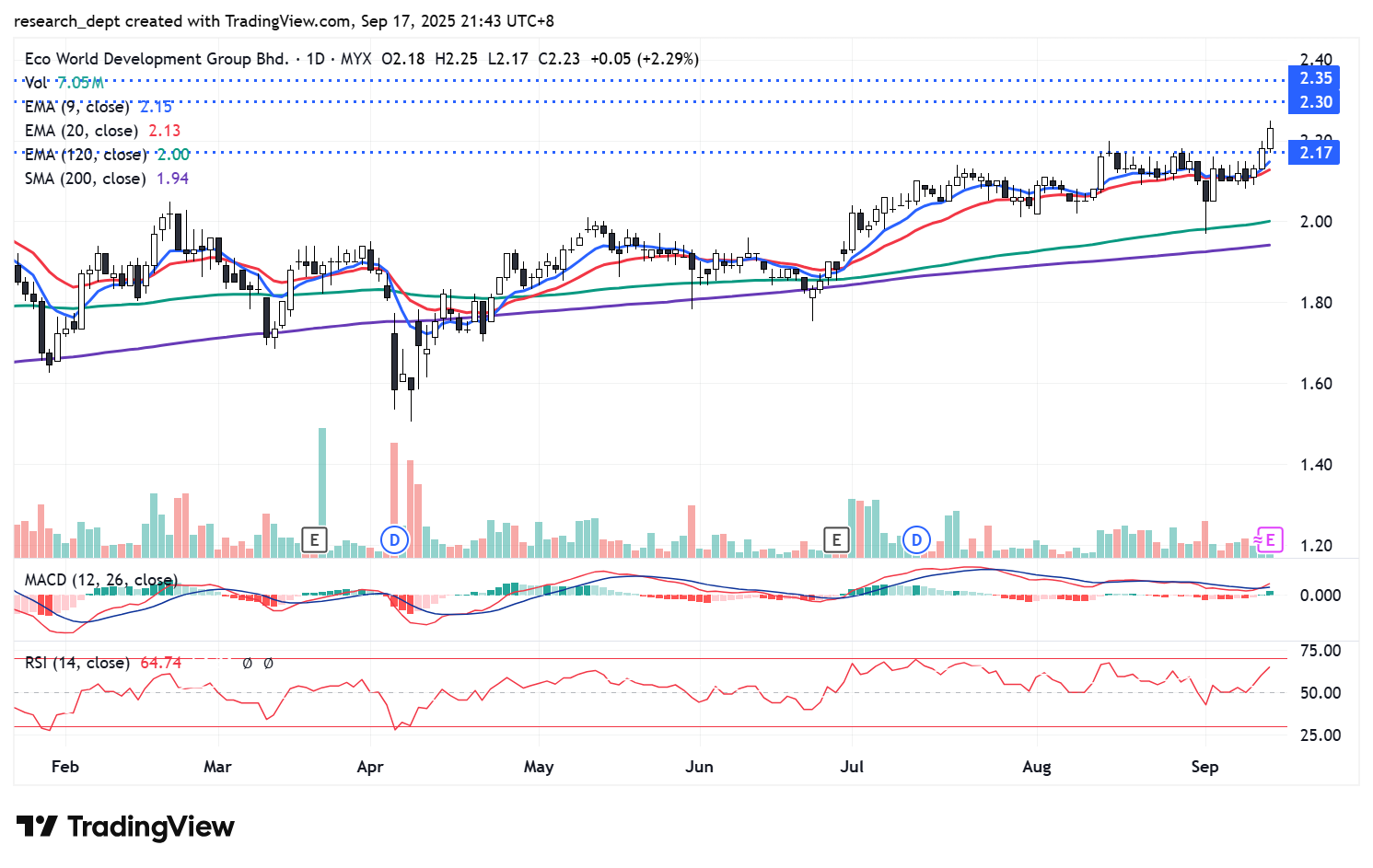 The stock consolidated for an extended period, briefly dipping to RM1.58 in April before stabilising. Momentum picked up in July, culminating in a breakout above RM2.17 recently. If strength persists, the next resistance is seen at RM2.30–RM2.35. On the downside, support is located at RM2.17.