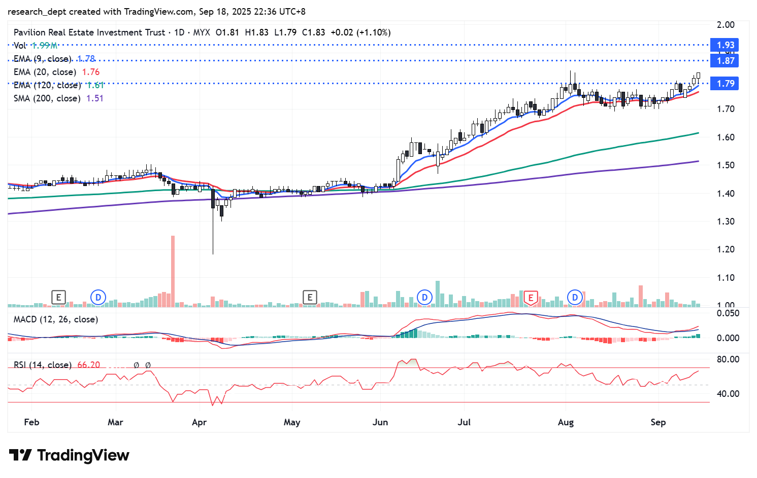 The stock moved sideways early in the year before a heavy sell-off in late March. Momentum strengthened in June, driving a steady uptrend with a breakout above RM1.79. The rally paused in August as the stock entered a consolidation phase. It is now trading near its all-time high, testing resistance at RM1.87–RM1.93, while support is envisaged at RM1.79.
