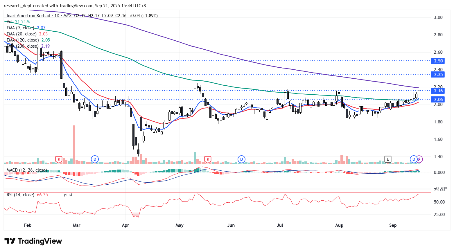 The share price remains in consolidation, having only briefly slipped below RM1.40 in early April before swiftly regaining upward momentum. Since then, the stock has continued to trade within a narrowing range and is now testing the SMA200. A breakout above RM2.16 would mark the resumption of upside momentum, opening scope for a move toward the next resistance zone at RM2.35–RM2.50. On the downside, immediate support is seen at RM2.06.