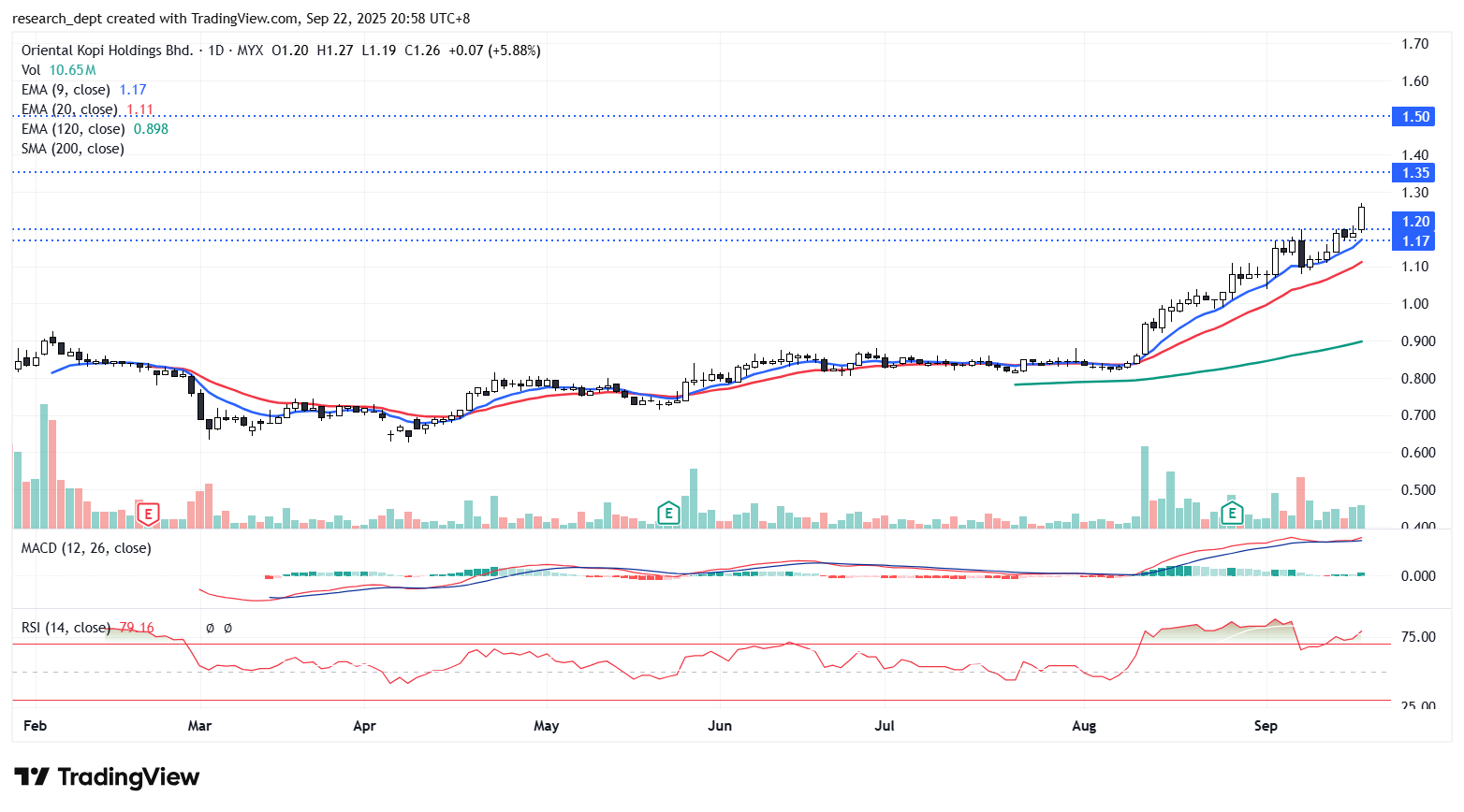 The share price was in consolidation, having only briefly dipped below RM0.645 in early April before swiftly reclaiming its upward trajectory. Since then, the stock has carved out a constructive pattern of higher highs and higher lows, underscoring the resilience of its underlying uptrend. More recently, a decisive breakout above the RM1.20 resistance has reinforced bullish sentiment, paving the way toward the next resistance at RM1.35–RM1.50. On the downside, immediate support is located at RM1.17.