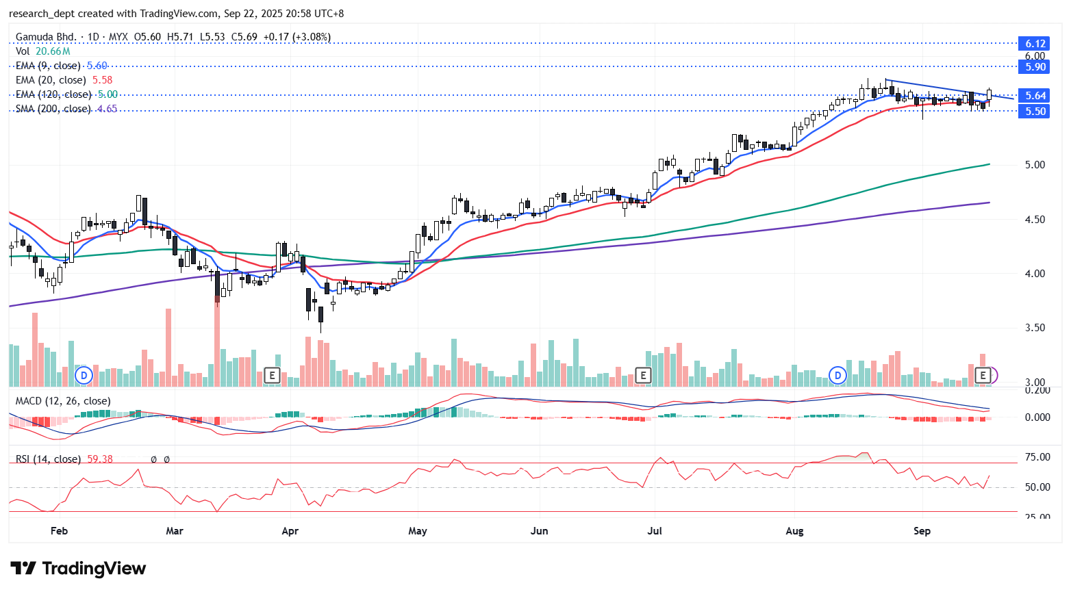 The stock staged a rally in early 2025 before encountering a temporary pullback that culminated in an April trough. Since then, a firm uptrend has taken shape, with the counter trading consistently above all key moving averages. More recently, the stock consolidated before breaking out above the RM5.64 resistance and descending trendline, paving the way for an advance toward the RM5.90–RM6.12 resistance zone. On the downside, immediate support is identified at RM5.50.