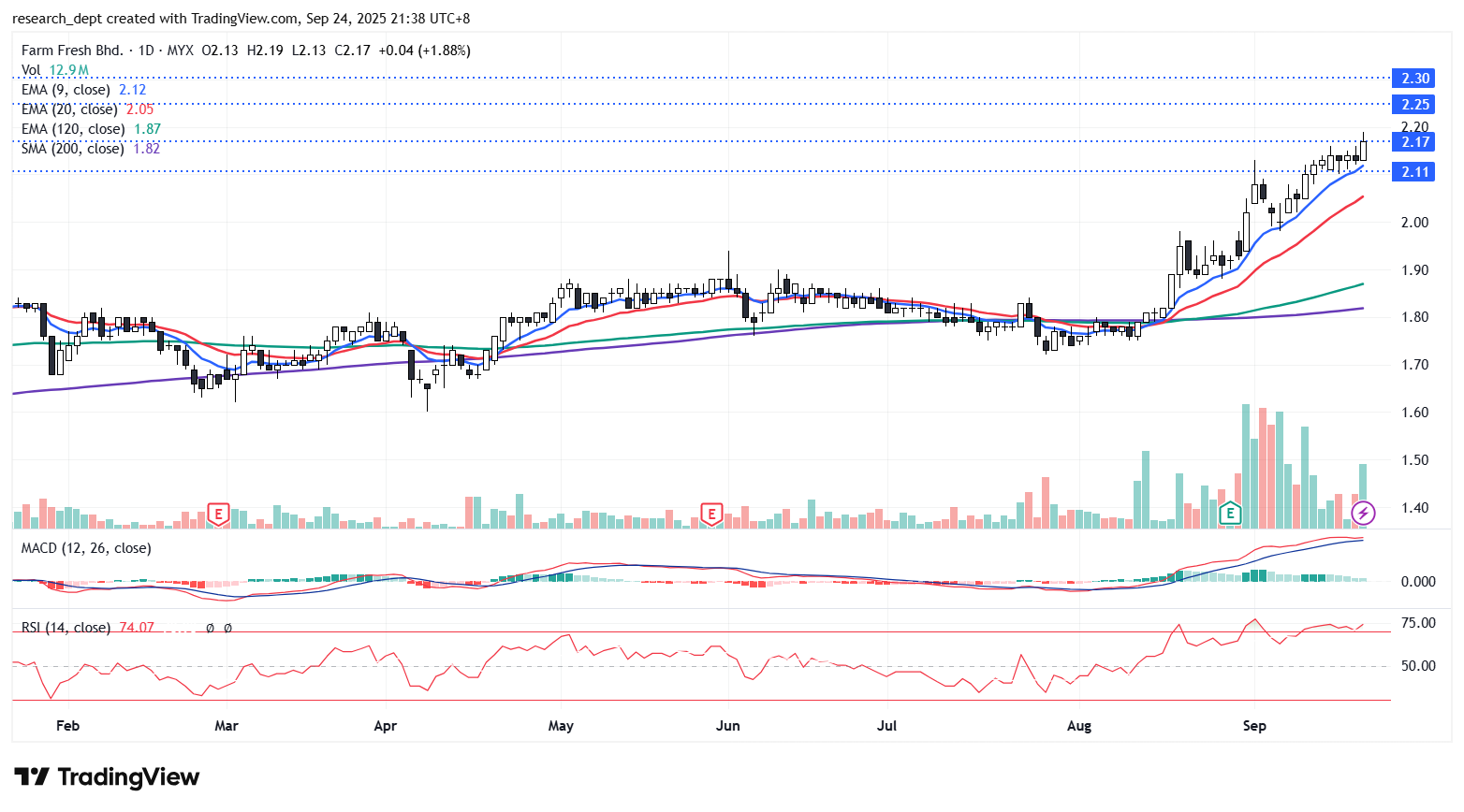 The stock has been in a broader consolidation pattern since the start of the year, with multiple dips below the SMA200 before gaining momentum recently to establish a new uptrend. A decisive breakout above RM2.17 would confirm the continuation of this uptrend, paving the way for an advance toward the RM2.25–RM2.30 resistance zone. On the downside, immediate support is located at RM2.11.