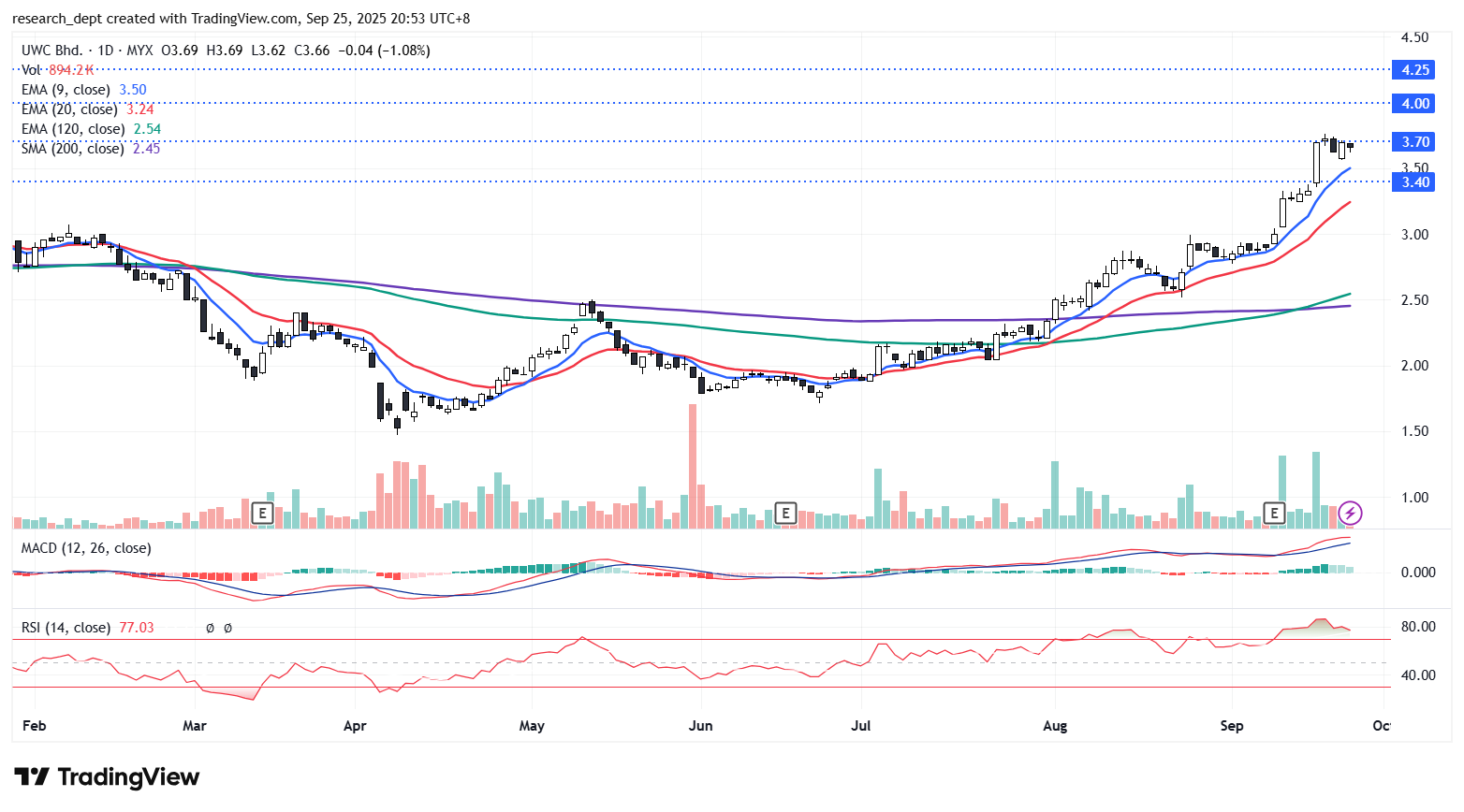 The stock bottomed out after forming an inverted head-and-shoulders pattern in early June, before regaining momentum to establish a new uptrend. It has since carved out a sequence of higher highs and higher lows, reinforcing the trend reversal. A breakout above RM3.70 would open scope for further upside toward the RM4.00–RM4.25 resistance zone. On the downside, immediate support is envisaged at RM3.40.
