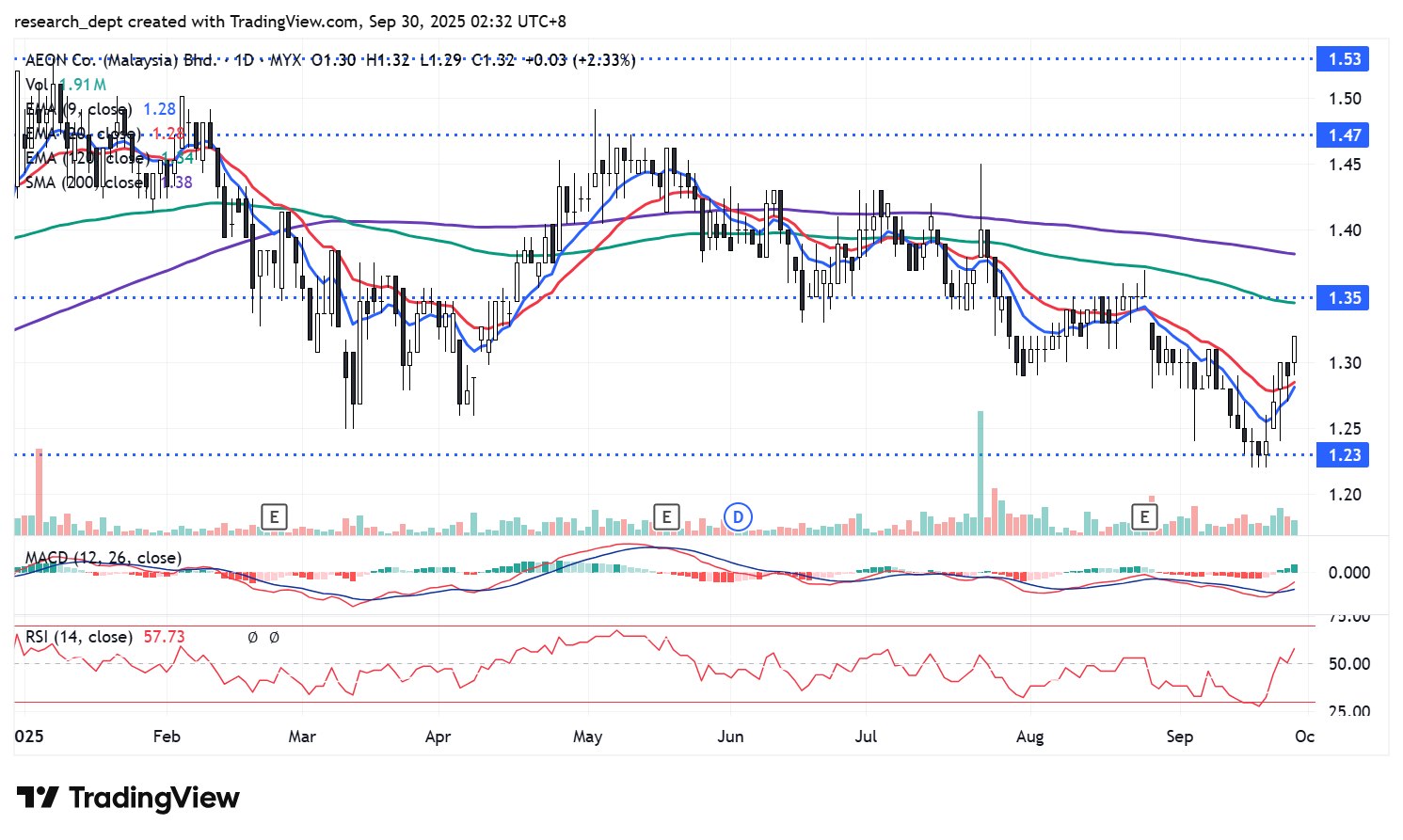 The stock has rebounded from its recent low of RM1.23, underpinned by improving momentum indicators and rising volumes. Price action has regained ground above the short-term moving averages, suggesting a potential shift in near-term sentiment. The immediate focus is on the RM1.35 level, where a breakout could unlock further upside toward the resistance zone at RM1.47-RM1.53. On the downside, RM1.23 serves as immediate support.