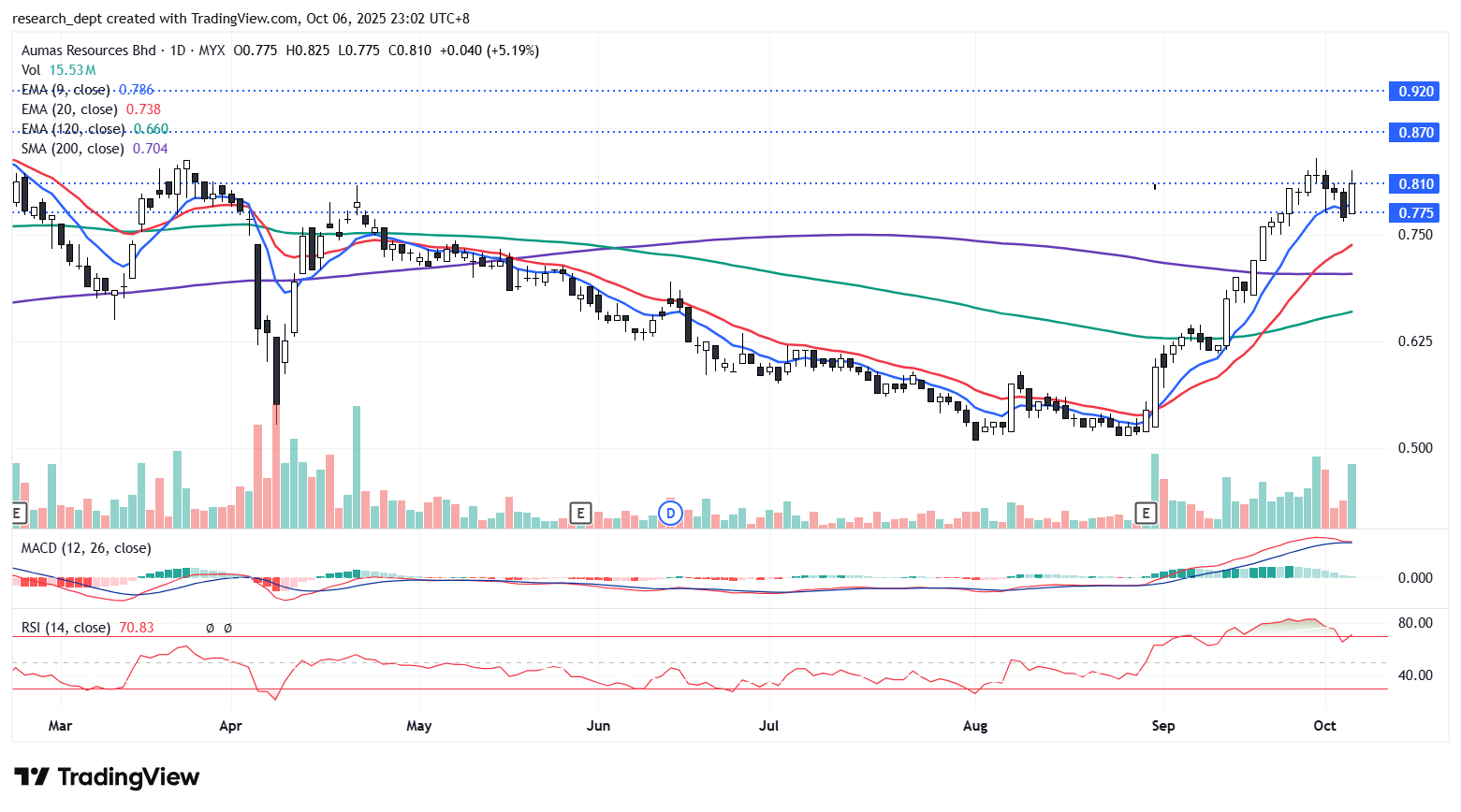 After bottoming out in September, the stock rebounded sharply above all its key moving averages, signalling a trend reversal. The stock is now consolidating near RM0.810, with momentum indicators still supportive. A breakout above this level could pave the way toward the next resistance zone at RM0.870–RM0.920, while RM0.775 acts as key support level.