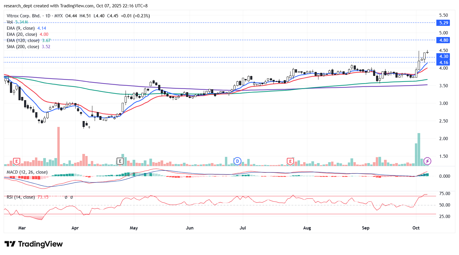 The stock formed a double bottom in April before regaining upward momentum and entering into a gradual uptrend. Over the past few months, price action has seen phases of consolidation with support holding above key moving averages, reflecting stabilisation and accumulation. The recent breakout above RM 4.30 confirms a decisive shift in sentiment, establishing that level as a new support base for further upside toward RM4.80–RM5.29. On the downside, immediate support is at RM4.16.