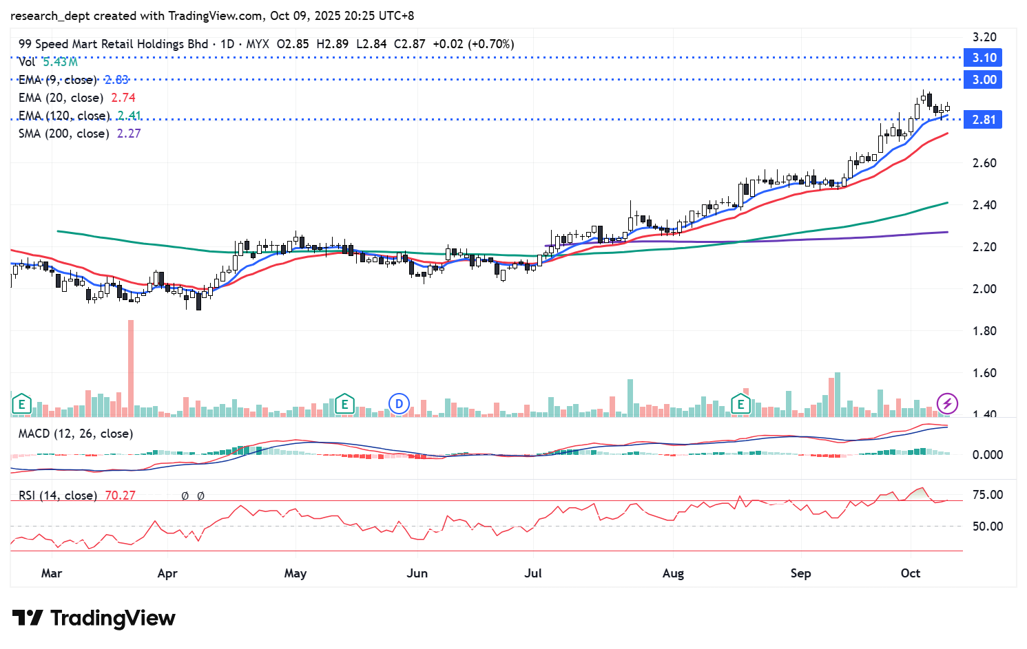 The stock consolidated below its key moving averages in March before gaining momentum and starting an uptrend in July. It recently broke above resistance at RM2.81 and is now retesting this level as support. A successful retest would confirm the breakout and increase the chance of further gains, with the next resistance zone at RM3.00–RM3.10, while RM2.81 serves as support.