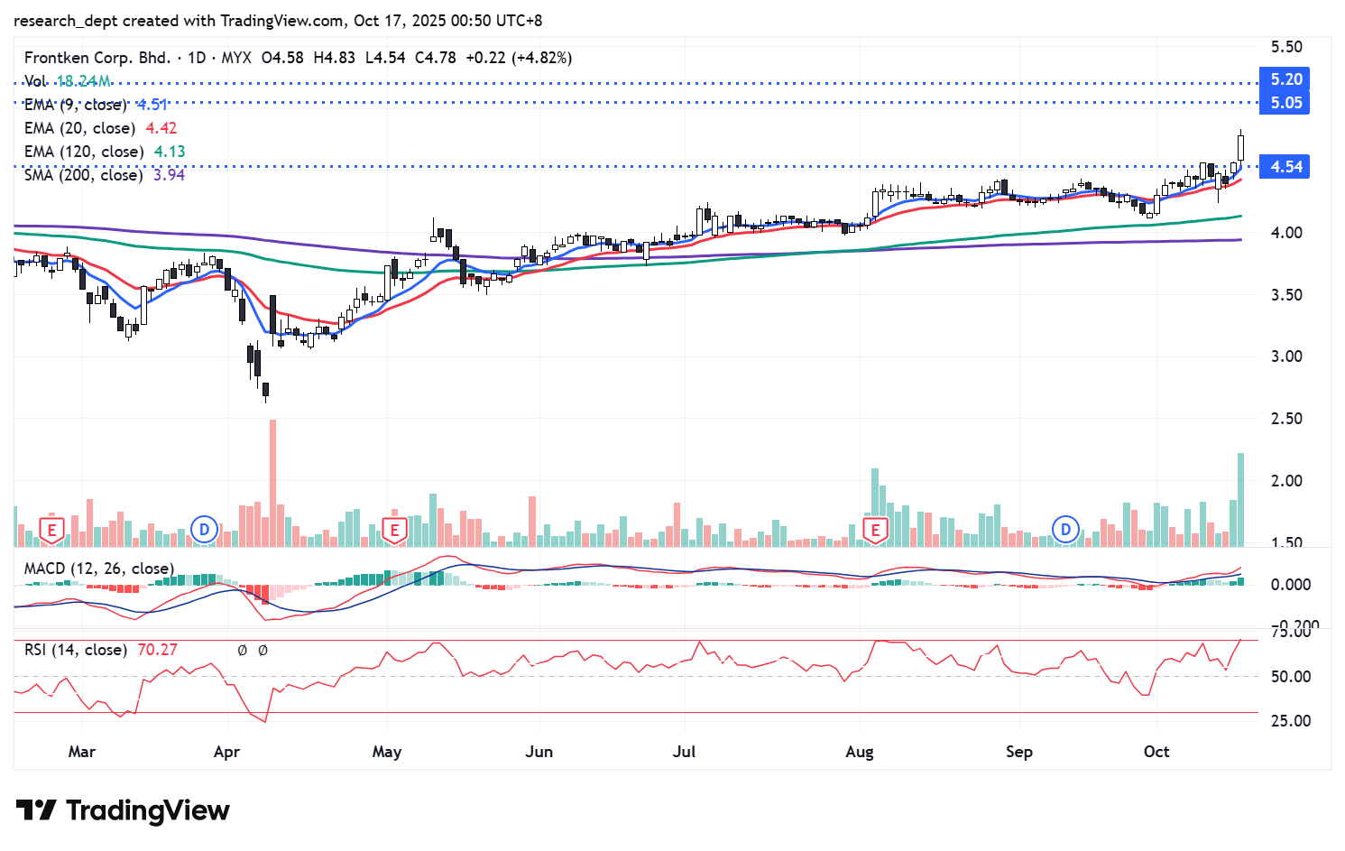 The stock traded sideways for most of the early year before bottoming near RM2.69. Momentum began building in May, followed by a period of consolidation. Recently, the counter broke above RM4.54 on a notable surge in volume, signalling renewed buying interest and a potential continuation of the uptrend. The next resistance zone is seen at RM5.05–RM5.20, while RM4.54 now serves as immediate support in the event of a pullback.