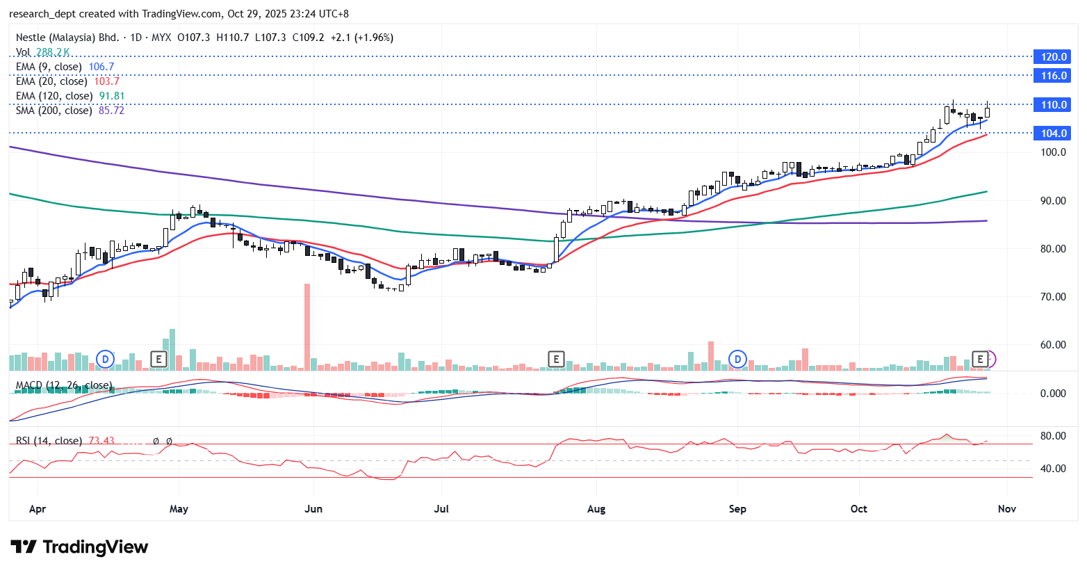 The stock staged a rally in the first half before encountering a temporary pullback and forming a double bottom in late July. Since then, a firm uptrend has taken shape, with the counter trading consistently above all key moving averages. More recently, the breakout above RM110.00 signalled a decisive shift in sentiment, establishing this level as a key support base for further upside toward the RM116.00 and RM120.00 level. On the downside, immediate support is identified at RM104.00.