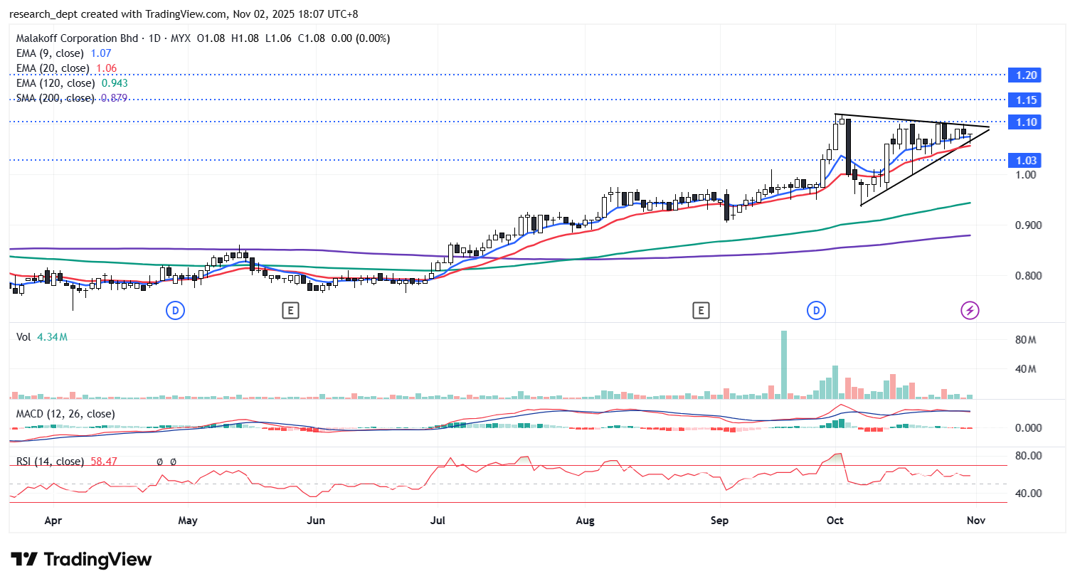 The stock has been trending higher since July, supported by constructive momentum and rising short-term moving averages. Recently, an ascending triangle has formed, indicating sustained accumulation below the key resistance at RM1.10. A breakout above this level would reaffirm bullish momentum and set the stage for further upside toward RM1.15 and RM1.20. Immediate support lies at RM1.03, with additional cushioning from the 20-day EMA (RM1.06).