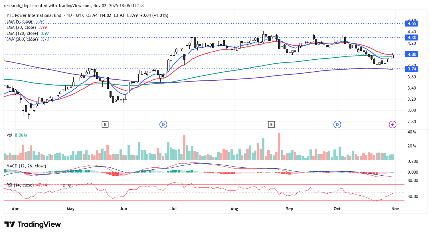 The stock tested the RM3.74 resistance in May and June before breaking out in July and trending higher above RM4.00 for several months. Recent pullback below RM4.00 suggests near-term consolidation, though the broader uptrend remains intact above the 200-day SMA (RM3.73). A rebound above RM4.00 would signal renewed bullish momentum toward RM4.30 and RM4.55, with RM3.74 as key support.