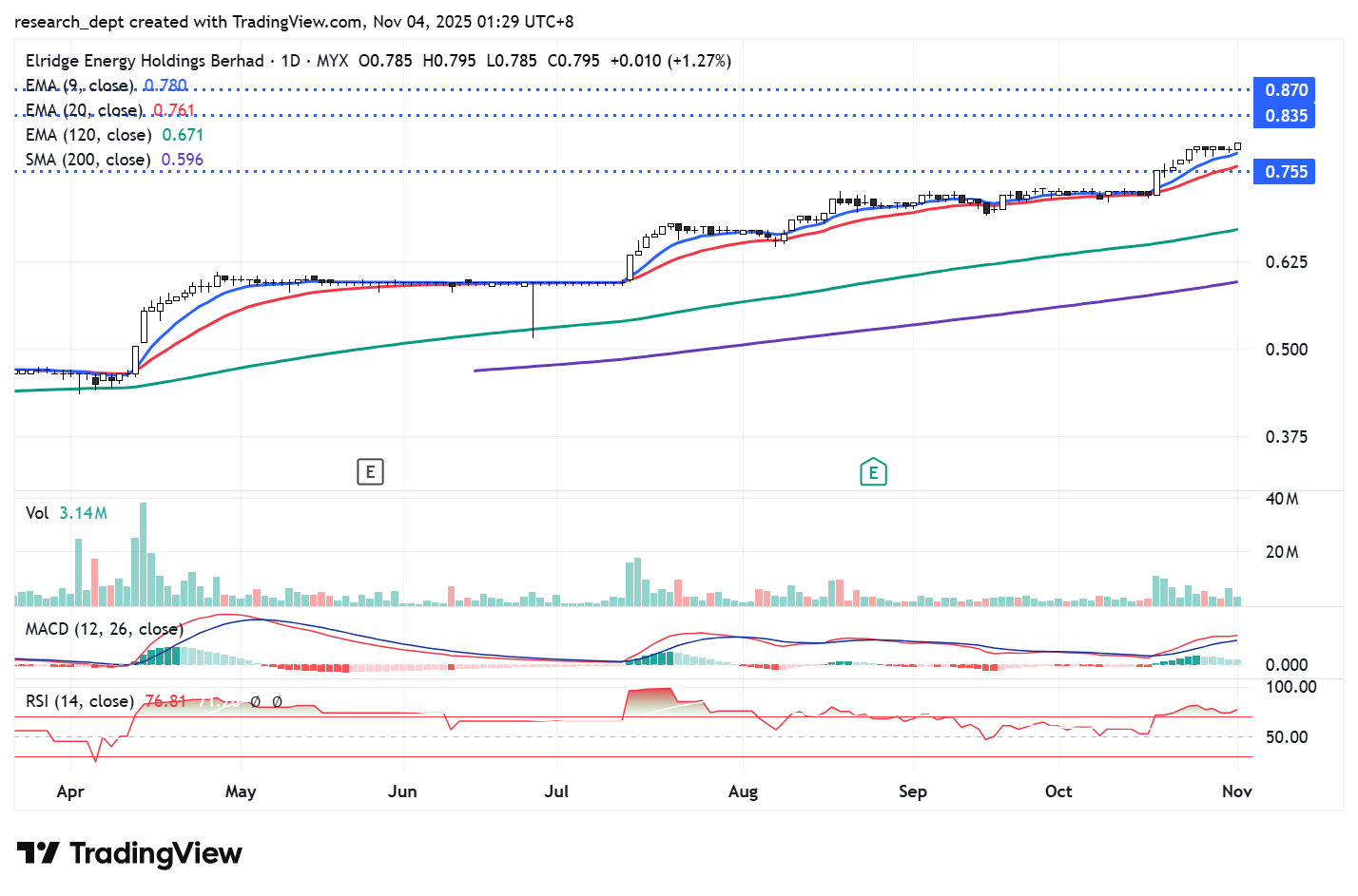 The stock traded sideways in the early months before gaining momentum in mid-April, climbing steadily above its key moving averages with rising volume. It is currently consolidating just above the RM0.755 support level, maintaining a healthy uptrend structure. A sustained move above this level would reinforce the bullish momentum and pave the way toward the next resistance at RM0.835 and RM0.870. Immediate support remains at RM0.755.