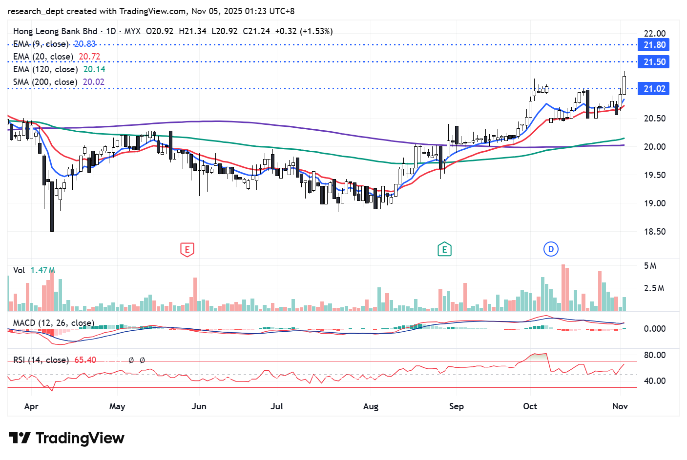 The stock bottomed near RM18.50 in April before gaining momentum and trading sideways below its key moving averages. In October, it strengthened and broke above the RM21.02 resistance level before briefly pulling back to retest this breakout zone. The stock has since rebounded above RM21.02, signalling renewed buying interest and a likely continuation of its uptrend toward the next resistance levels at RM21.50 and RM21.80. On the downside, support is located at RM21.02.