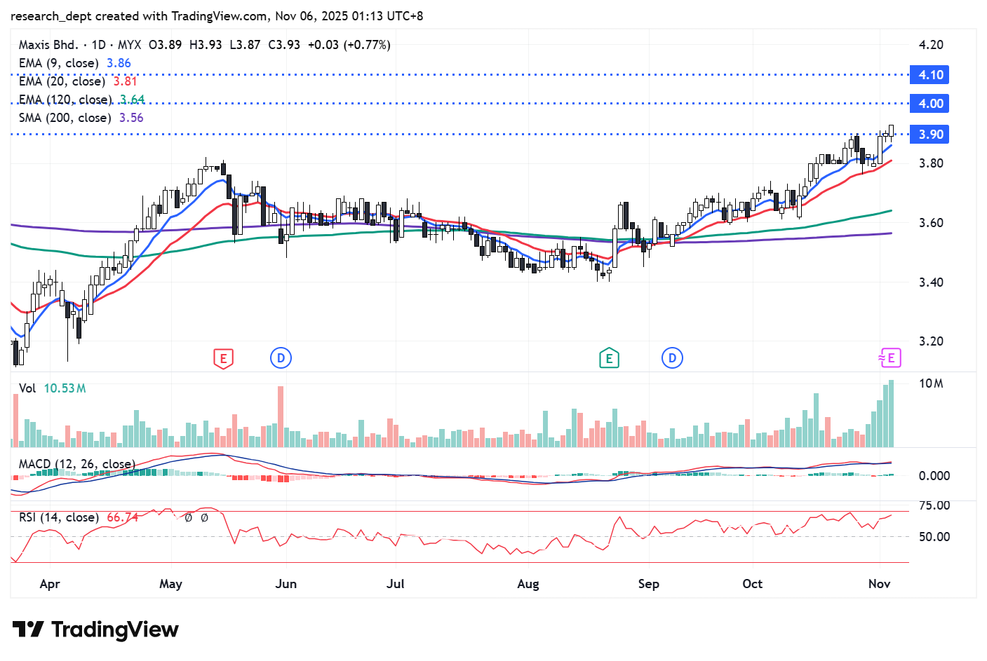 The stock gained momentum in September after several months of consolidation and recently broke above its immediate resistance at RM3.90, rebounding firmly above key moving averages. Momentum indicators have also strengthened, with the RSI hovering near 67, signalling sustained buying interest. The next resistance levels are identified at RM4.00 and RM4.10, while immediate support is located at RM3.90.