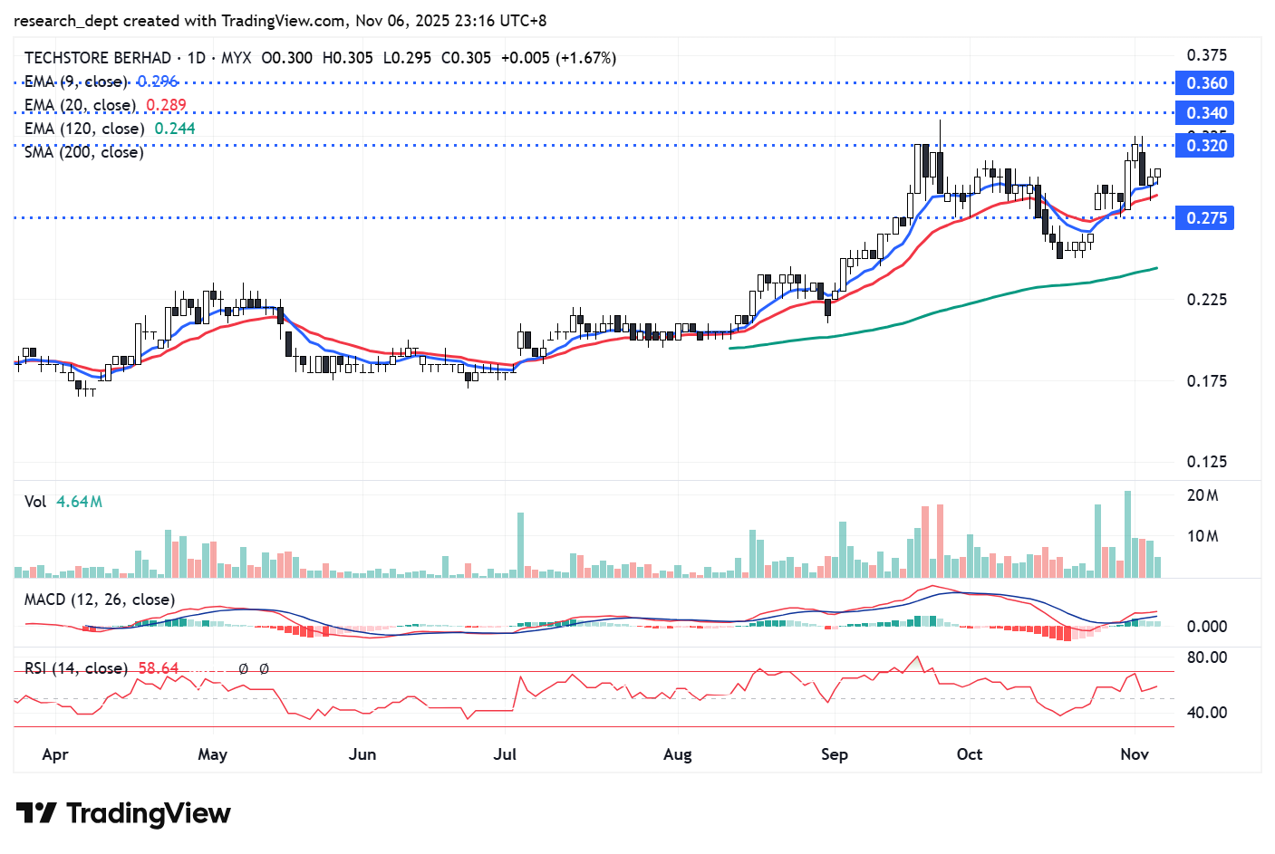 The stock was in consolidation until September before gaining strength and beginning an upward trend, with brief pullbacks along the way. It is currently testing resistance at RM0.320. A decisive breakout above RM0.320, accompanied by strong volume, would likely signal a continuation of bullish momentum toward the next resistance levels at RM0.340 and RM0.360. On the downside, support is located at RM0.275.