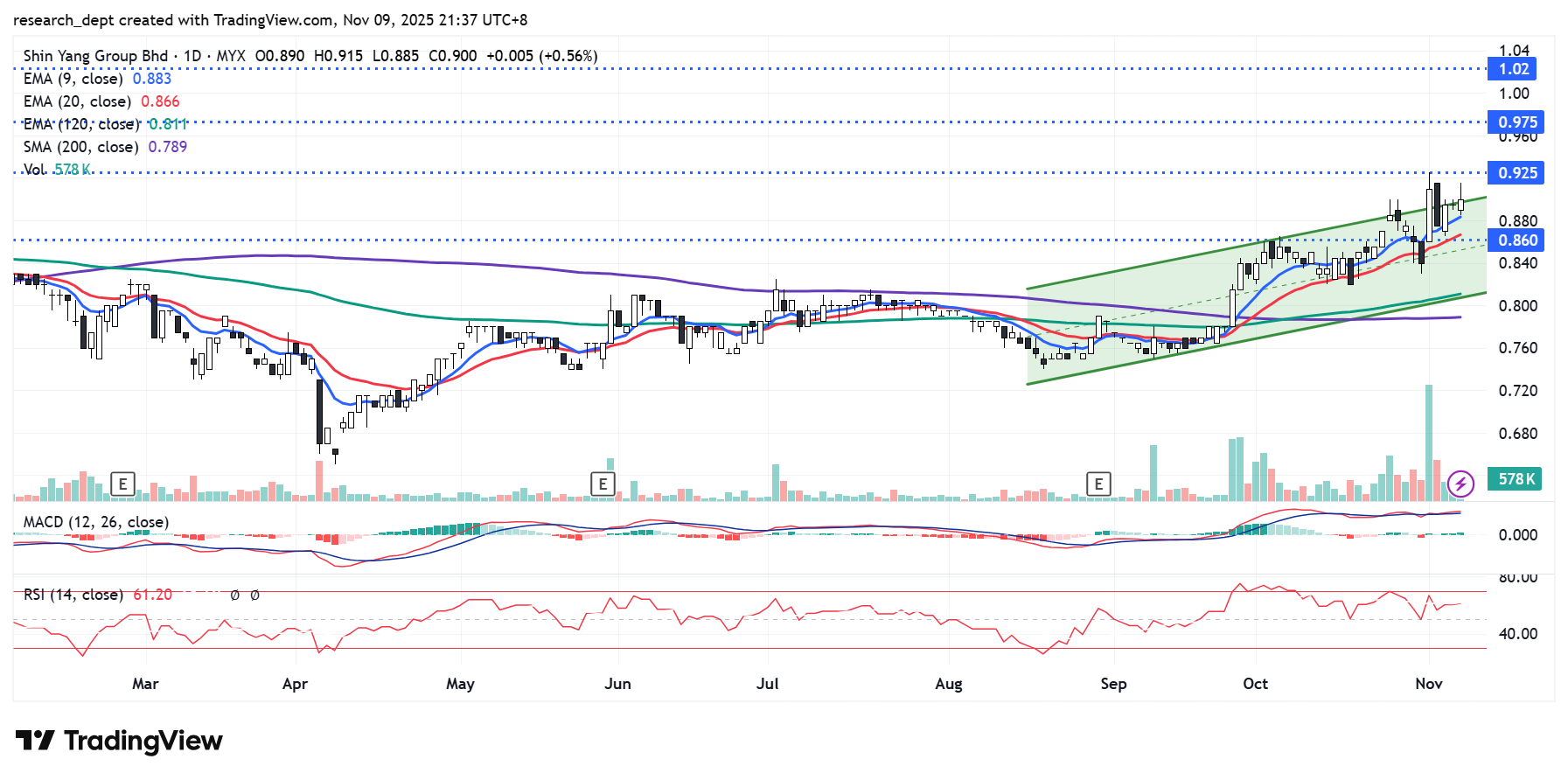 The counter has been trending within an ascending channel since early September. The recent crossover of the 9-day EMA above the 20-day EMA signals sustained bullish momentum. A breakout above RM0.925 would confirm the continuation of the uptrend, paving the way toward the next resistance levels at RM0.975 and RM1.02. On the downside, RM0.86 serves as immediate support, coinciding with the lower boundary of the trend channel and the 20-day EMA.