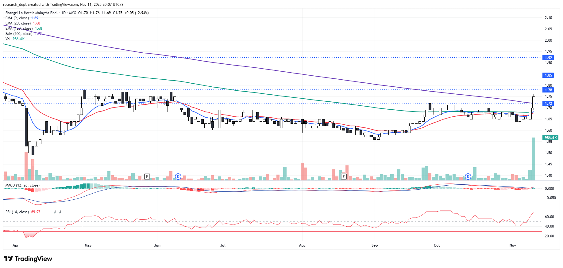 The counter has been trading within a narrow consolidation range since late September. A recent pickup in volume, coupled with strengthening signals from the MACD and RSI, has propelled the price above its immediate resistance at RM1.72. A decisive breakout beyond RM1.78 would confirm an uptrend formation and solidify the near-term bullish setup, potentially paving the way toward RM1.85 and RM1.92. The key support level is identified at RM1.72.