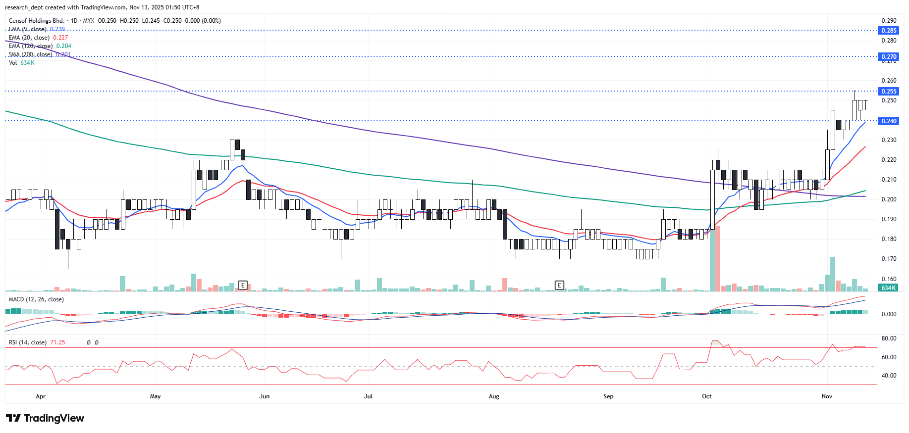 The stock staged a breakout earlier at RM0.240, supported by rising EMAs, expanding volume, and a bullish MACD crossover, all signalling the start of an uptrend formation. Traders may look to accumulate on a breakout above RM0.255, where a sustained hold would pave the way towards RM0.270 and RM0.285. Immediate support is located at RM0.240, serving as the near-term pivot.