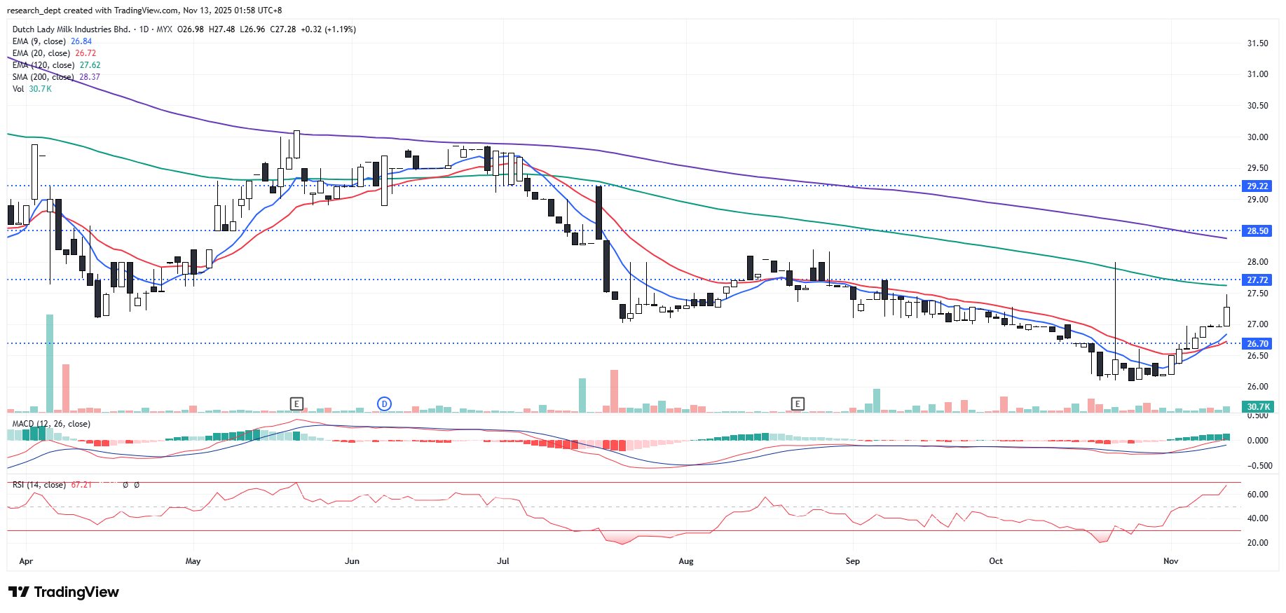 The stock has rebounded strongly from its recent base, supported by improving momentum in both the MACD and RSI, indicating a strengthening bullish bias. Price action is now approaching the breakout level at RM27.72, where a decisive close above this threshold would confirm a short-term trend reversal. A convincing breakout could accelerate upside momentum toward RM28.50, followed by RM29.22. Immediate support is located at RM26.70.