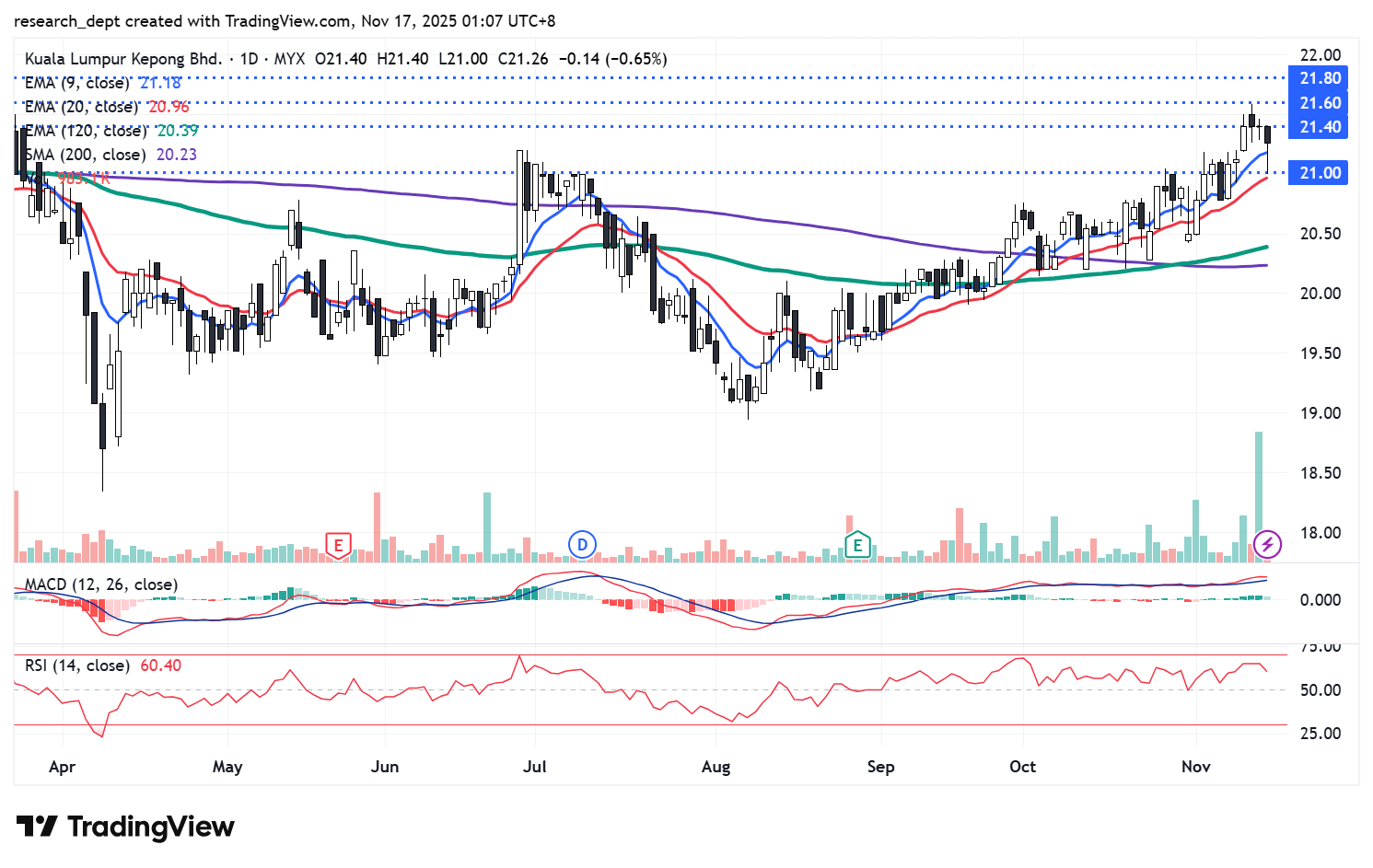 Momentum turned constructive in late August as price stabilised and inched above the short-term EMAs, with a stronger bullish shift from late September as higher lows formed and the stock climbed f irmly above the EMA9 and EMA20 before breaking the 200-day SMA. It now hovers near immediate resistance at RM21.40. A decisive breakout above this level may pave the way toward RM21.60 and RM21.80 resistance levels, while support is at RM21.00.