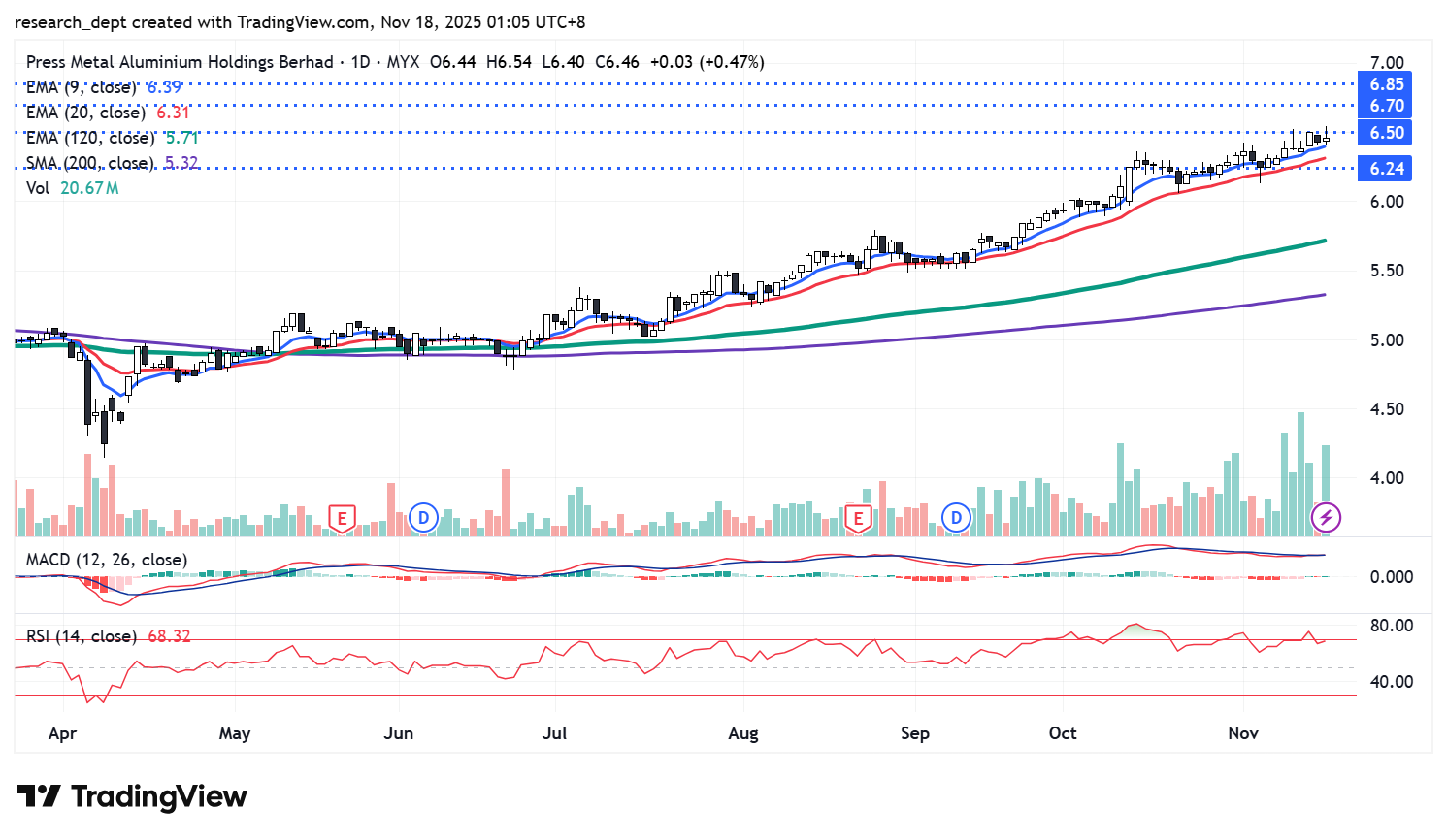 The stock has been in a steady uptrend since July, consistently holding above its short-term EMAs and printing higher highs and higher lows. It is now testing the RM6.50 resistance, where a decisive breakout backed by stronger volume could propel the stock toward next upside targets at RM6.70 and RM6.85. Immediate support is located at RM6.24.