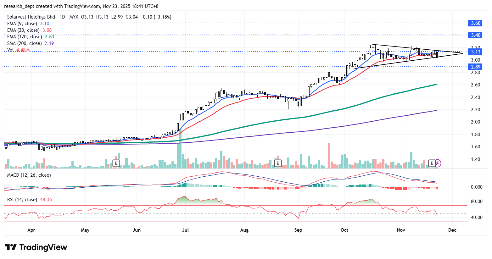 The stock has displayed notable resilience since June, consistently holding above its key moving averages while volume dynamics continue to improve. It is currently consolidating within a symmetrical triangle just below the RM3.13 resistance. A clean breakout above this level would signal a continuation of the uptrend, opening upside toward RM3.40 and RM3.60. Immediate support is located at RM2.89.