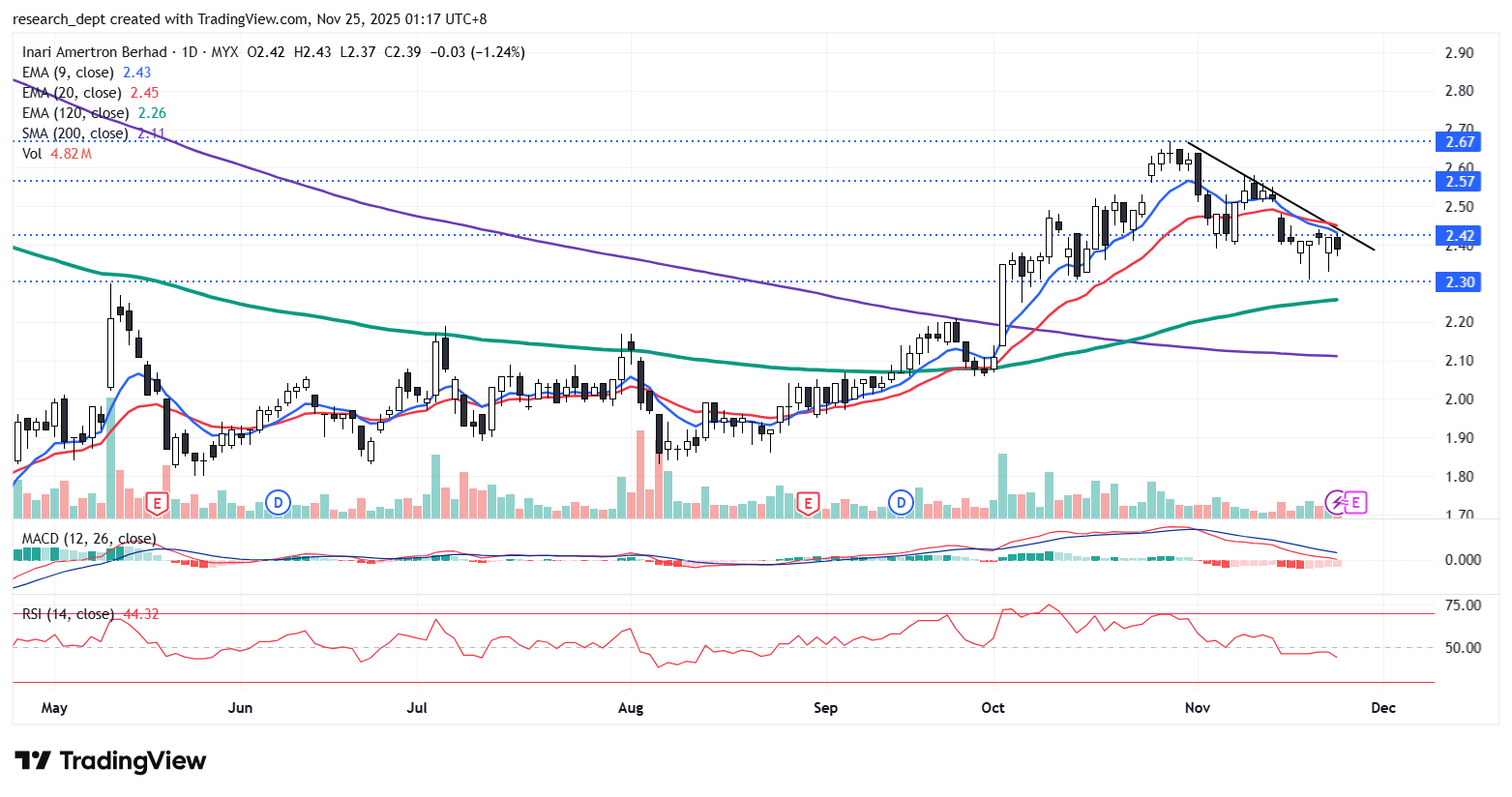 After retesting the RM1.85 support for the third time in August, the stock embarked on a three-month impulsive advance before peaking near the RM2.67 resistance. It is now consolidating just below its short-term trendline resistance at RM2.42. A decisive breakout above this level would reaffirm the uptrend and pave the way toward RM2.57 and RM2.67, while immediate support is located at RM2.30.