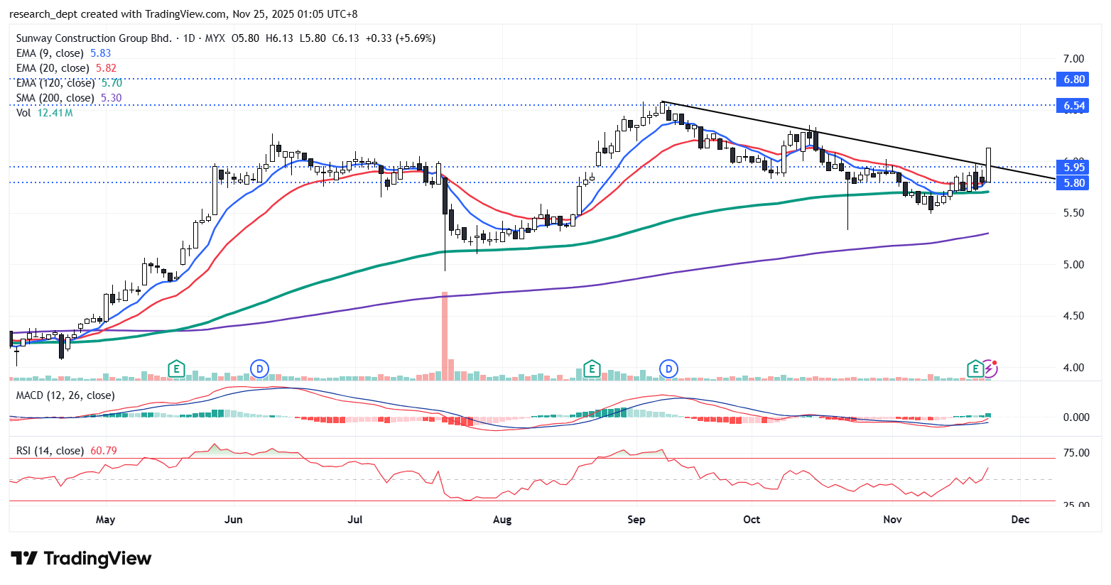 After retesting the EMA120 level in mid-July, the stock entered a prolonged downtrend by a series of lower highs. It has now staged a decisive breakout above the descending trendline near RM5.95, supported by improving volume and a close above the short-term EMAs. With the breakout confirmed, the stock is now poised to target the next resistance levels at RM6.54 and RM6.80, while immediate support is located at RM5.80.