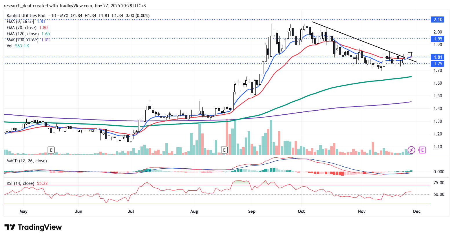 After topping out in October, the stock retraced and formed a sequence of lower highs along a descending trendline. Recently price showed a constructive rebound with the candles breaking above the trendline resistance while reclaiming the short-term EMAs. With the breakout confirmed, the stock is now poised to target the next resistance at RM1.95 and RM2.10, while immediate support is located at RM1.75.